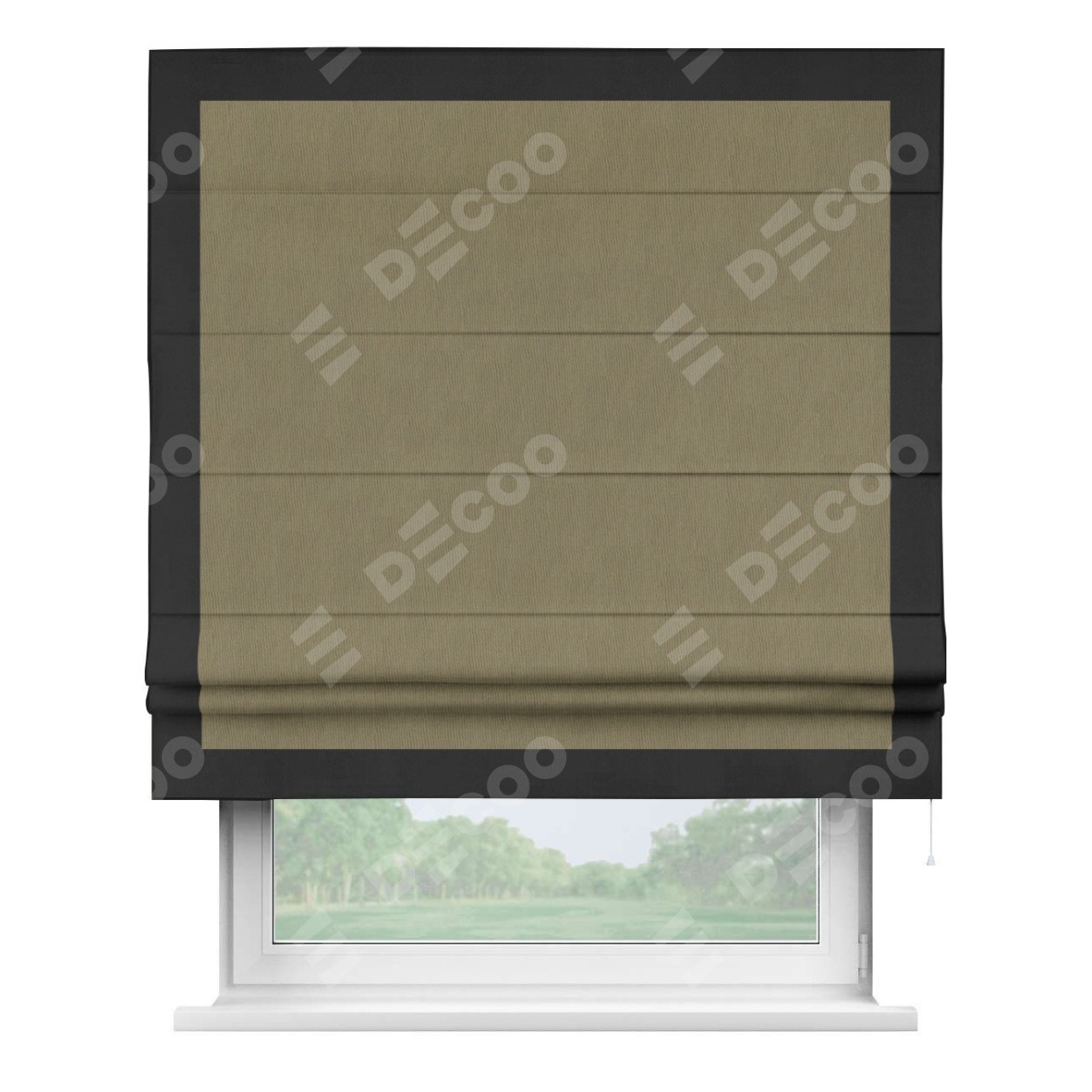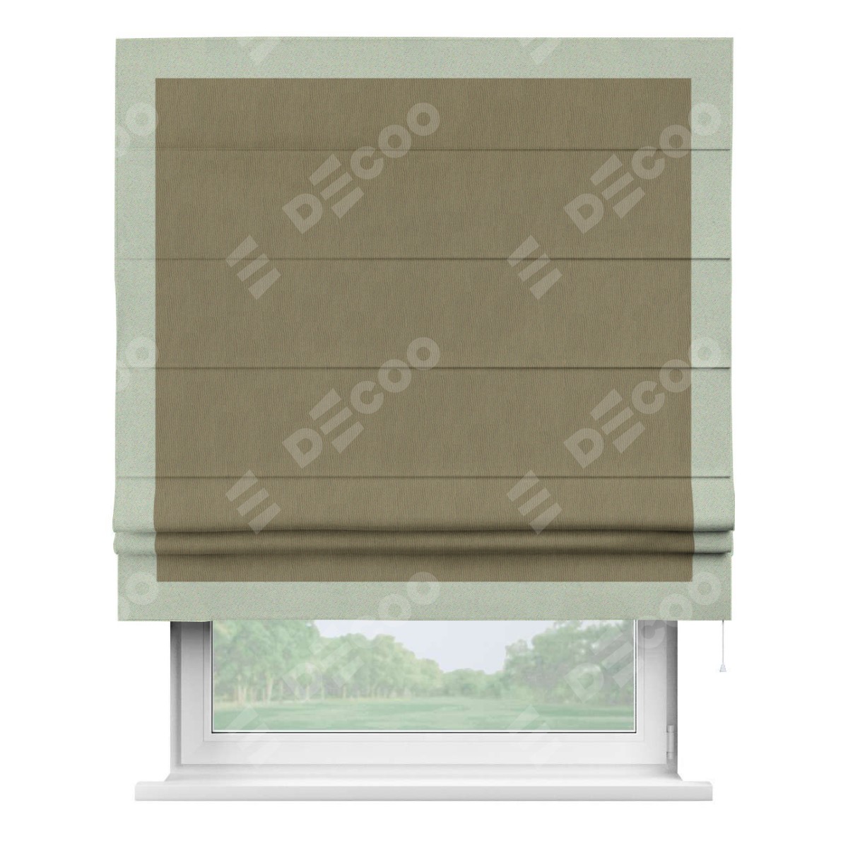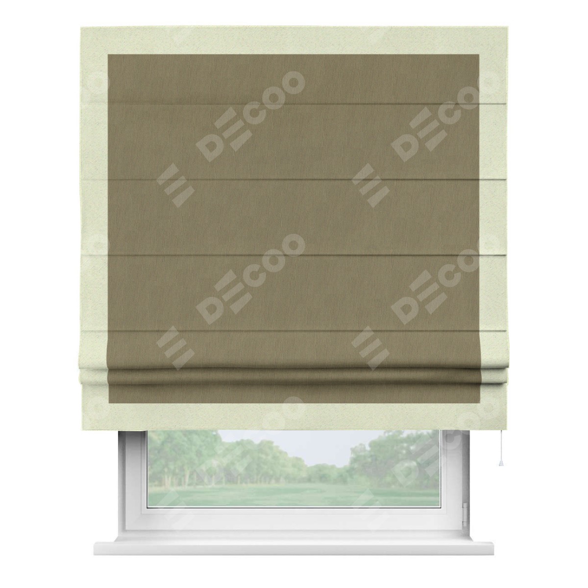 Римская штора производителя «Cortin», используется для проёма, пошита из ткани блэкаут однотонный бежево-золотой, артикул ткани 12095−2. Отделка шторы кантом «Чесс», ткань для канта используется из блэкаута однотонного разной расцветки на выбор. Имеет универсальный механизм и подходит для монтажа: на потолок, на стену и в нишу.