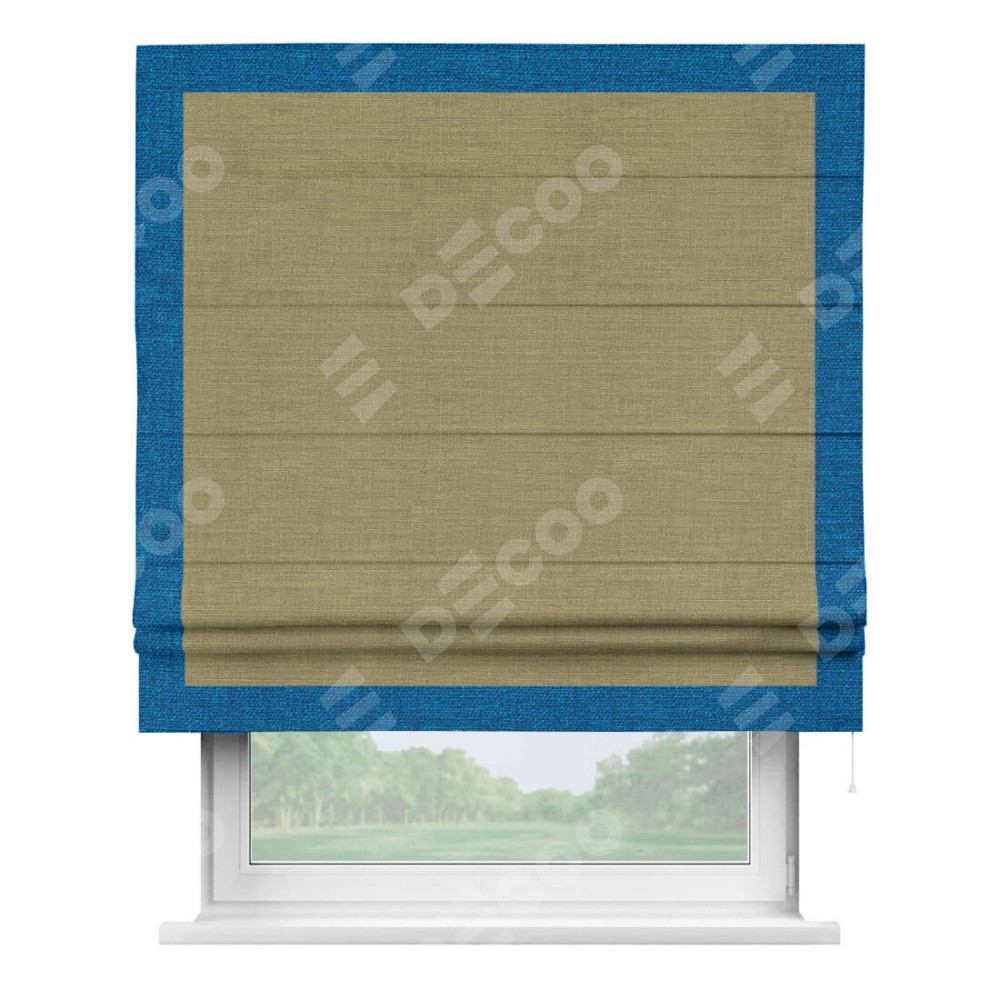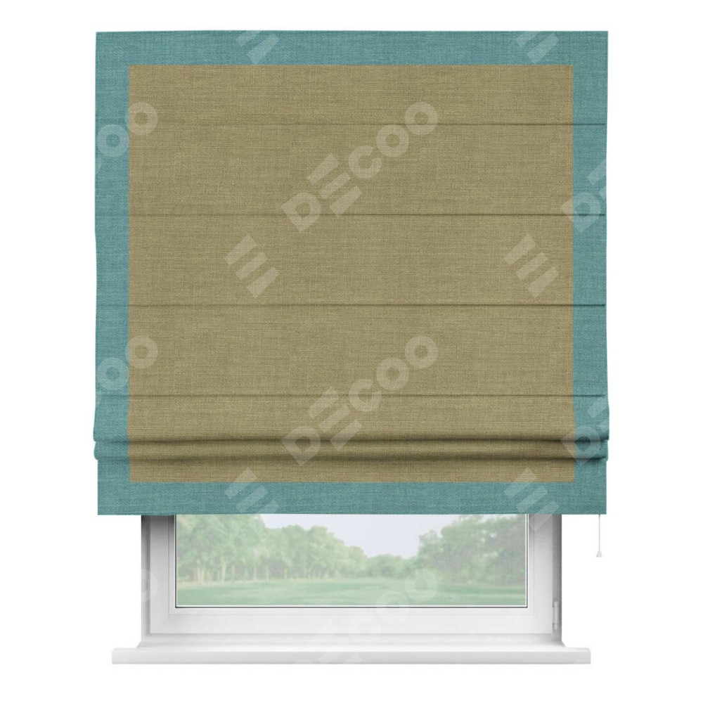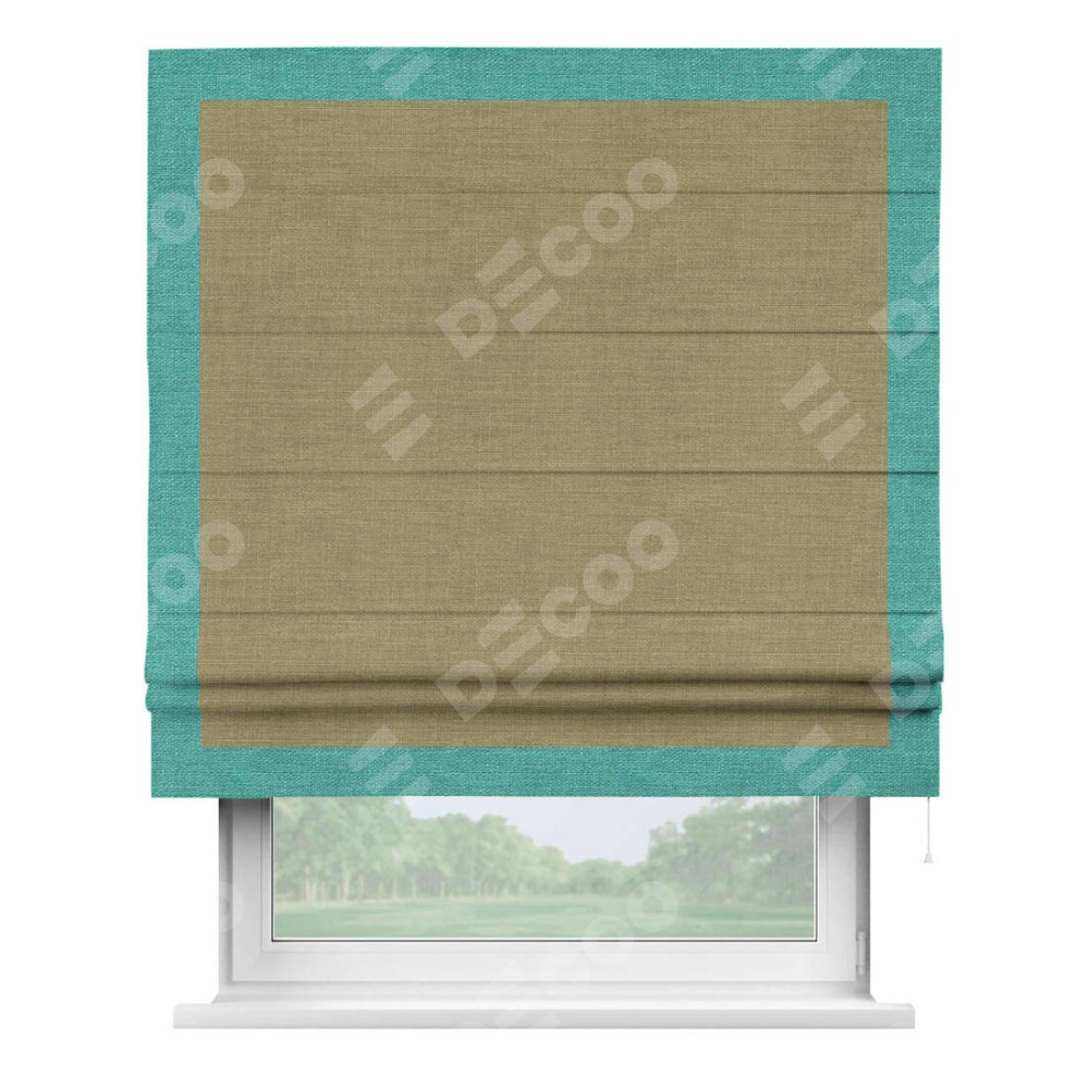 Римская штора производителя «Cortin», используется для проёма, пошита из ткани лён коричневый, артикул 7443. Отделка шторы кантом «Чесс», ткань для канта используется из льна разной расцветки на выбор. Имеет универсальный механизм и подходит для монтажа: на потолок, на стену и в нишу.