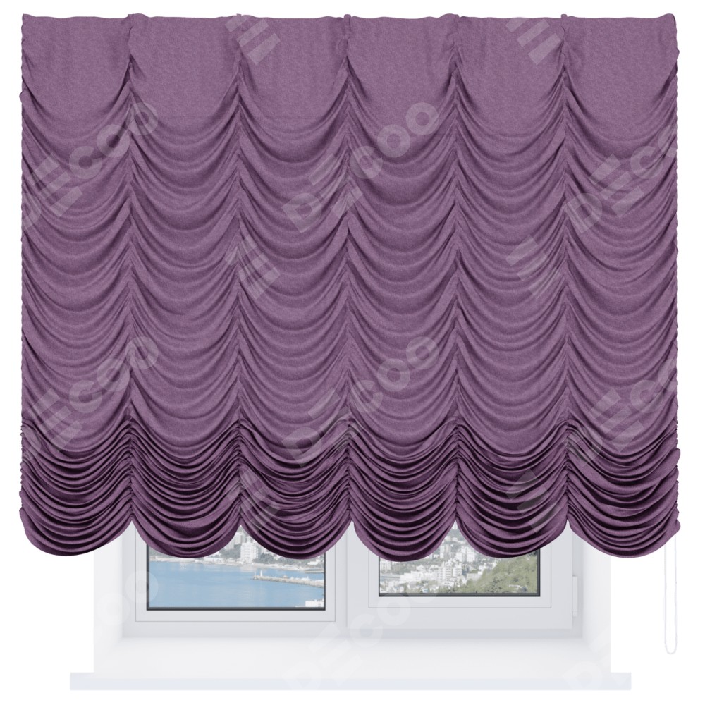 Французская штора производителя «Cortin», используется для проёма, пошита из ткани лён кашемир сиреневый, артикул ткани 21620. Имеет универсальный механизм и подходит для монтажа: на потолок и на стену.