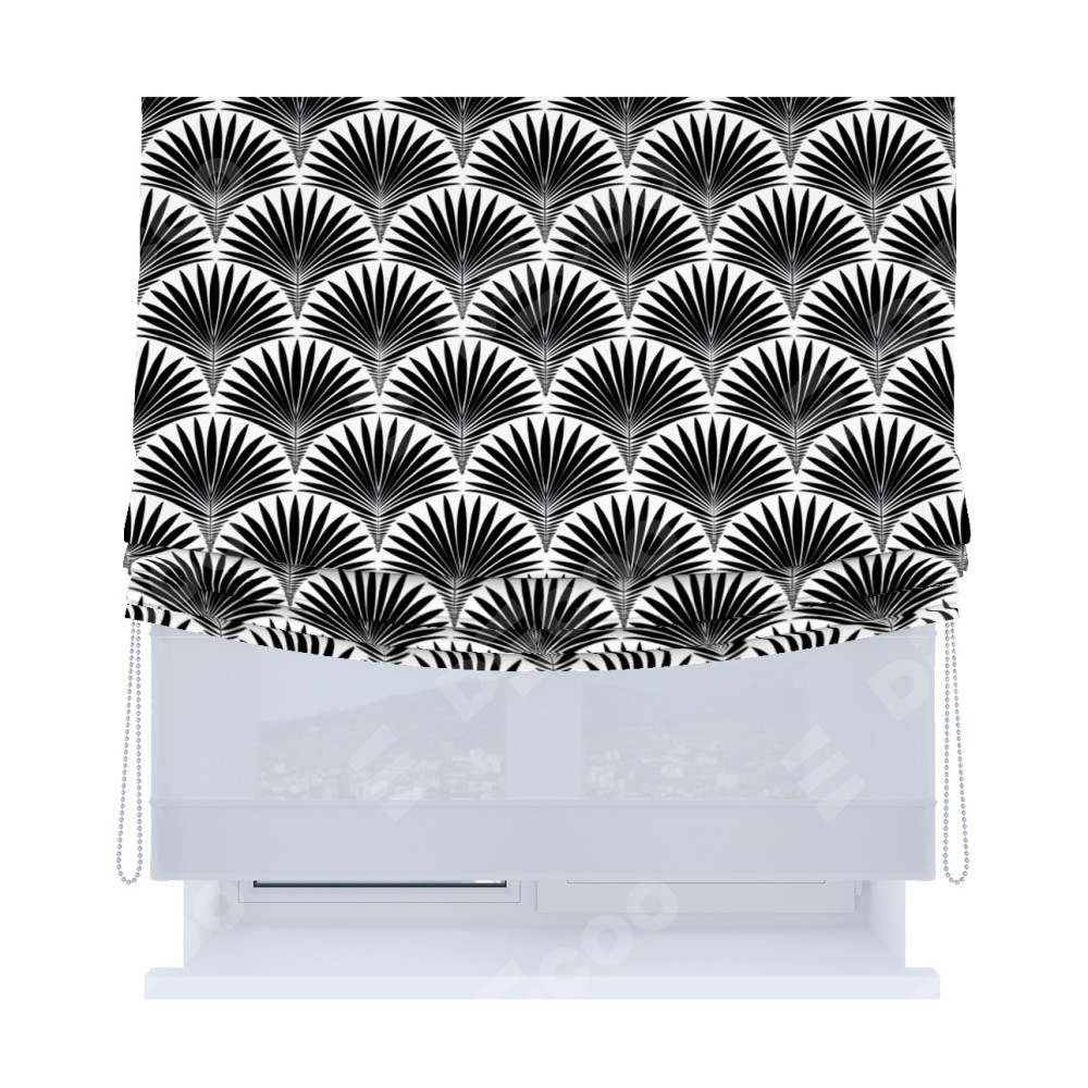 Римская штора день-ночь производителя «Cortin», используется для проёма, пошита из двух полотен, с лицевой блэкаут с нанесением сублимационной печати «Арт-деко листья черный», вторая ткань тюль (по стандарту комплектуется тюль белого цвета артикул V-01). Имеет универсальный механизм и подходит для монтажа: на потолок, на стену и в нишу. Удобное управление каждой шторой отдельно.