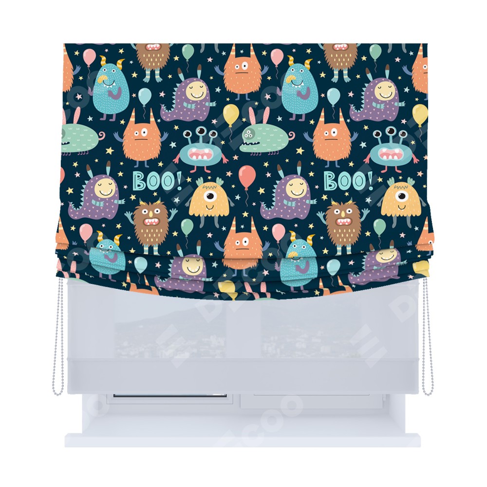 Римская штора день-ночь производителя «Cortin», используется для проёма, пошита из двух полотен, с лицевой блэкаут с нанесением сублимационной печати «Звёздные страшилки», вторая ткань тюль (по стандарту комплектуется тюль белого цвета артикул V-01). Имеет универсальный механизм и подходит для монтажа: на потолок, на стену и в нишу. Удобное управление каждой шторой отдельно.