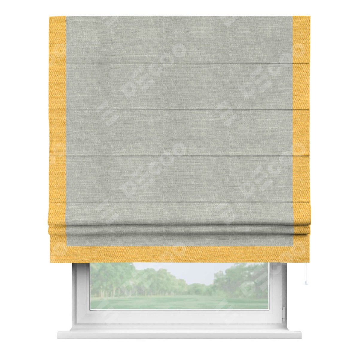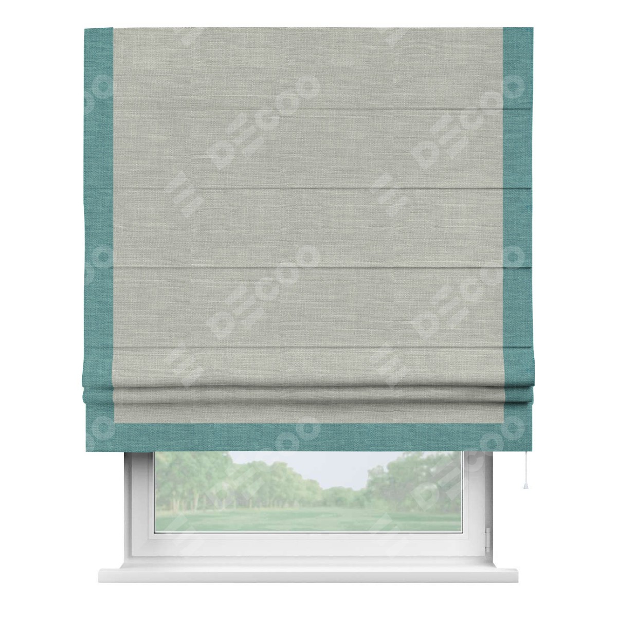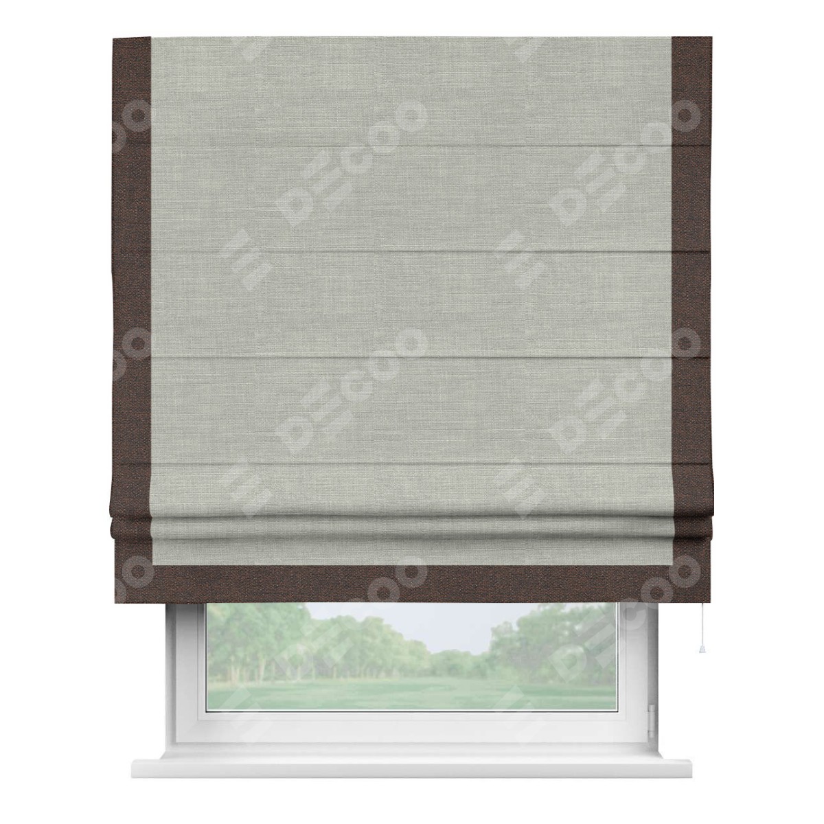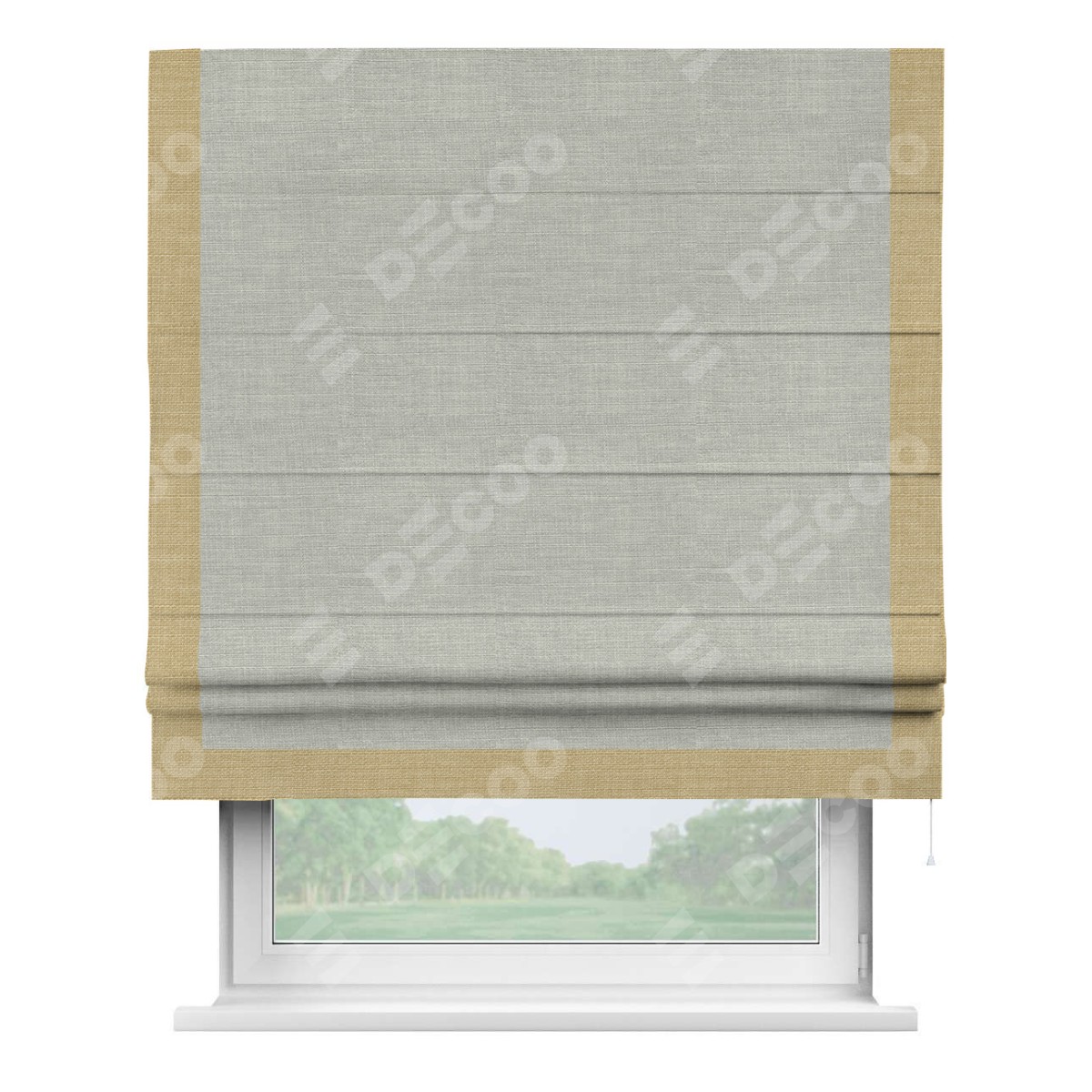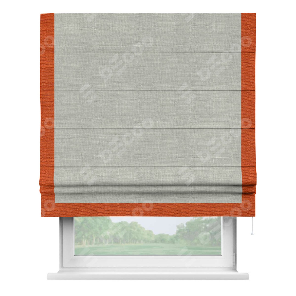 Римская штора производителя «Cortin», используется для проёма, пошита из ткани лён серый, артикул 7440. Отделка шторы кантом «Виктория», ткань для канта используется из льна разной расцветки на выбор. Имеет универсальный механизм и подходит для монтажа: на потолок, на стену и в нишу.