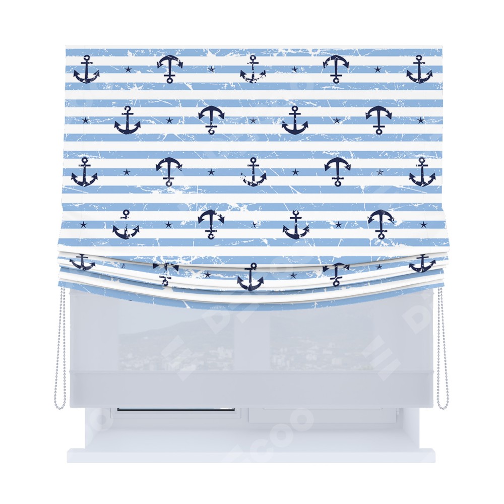 Римская штора день-ночь производителя «Cortin», используется для проёма, пошита из двух полотен, с лицевой блэкаут с нанесением сублимационной печати «Полоски и якори», вторая ткань тюль (по стандарту комплектуется тюль белого цвета артикул V-01). Имеет универсальный механизм и подходит для монтажа: на потолок, на стену и в нишу. Удобное управление каждой шторой отдельно.