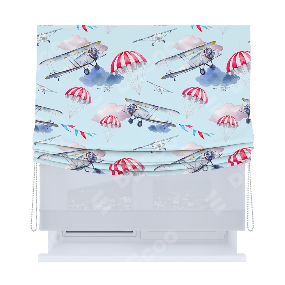Римская штора день-ночь производителя «Cortin», используется для проёма, пошита из двух полотен, с лицевой блэкаут с нанесением сублимационной печати «Самолёт», вторая ткань тюль (по стандарту комплектуется тюль белого цвета артикул V-01). Имеет универсальный механизм и подходит для монтажа: на потолок, на стену и в нишу. Удобное управление каждой шторой отдельно.