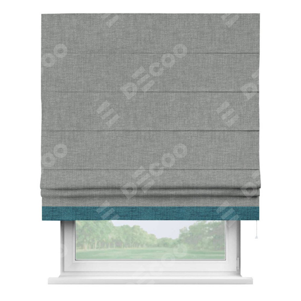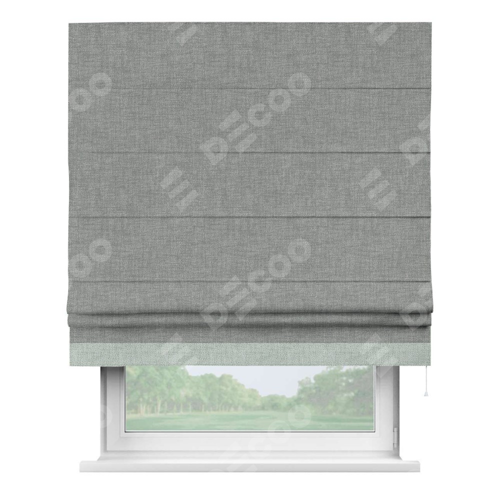 Римская штора производителя «Cortin», используется для проёма, пошита из ткани рогожка димаут тёмно-серый, артикул 80418. Отделка шторы кантом «Джестер», ткань для канта используется из рогожки димаут разной расцветки на выбор. Имеет универсальный механизм и подходит для монтажа: на потолок, на стену и в нишу.