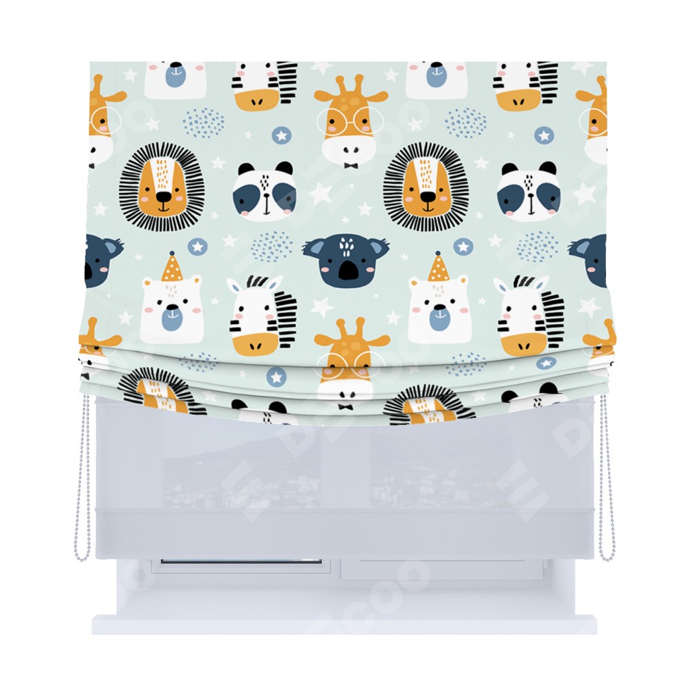 Римская штора день-ночь производителя «Cortin», используется для проёма, пошита из двух полотен, с лицевой блэкаут с нанесением сублимационной печати «Чудесный зоопарк», вторая ткань тюль (по стандарту комплектуется тюль белого цвета артикул V-01). Имеет универсальный механизм и подходит для монтажа: на потолок, на стену и в нишу. Удобное управление каждой шторой отдельно.