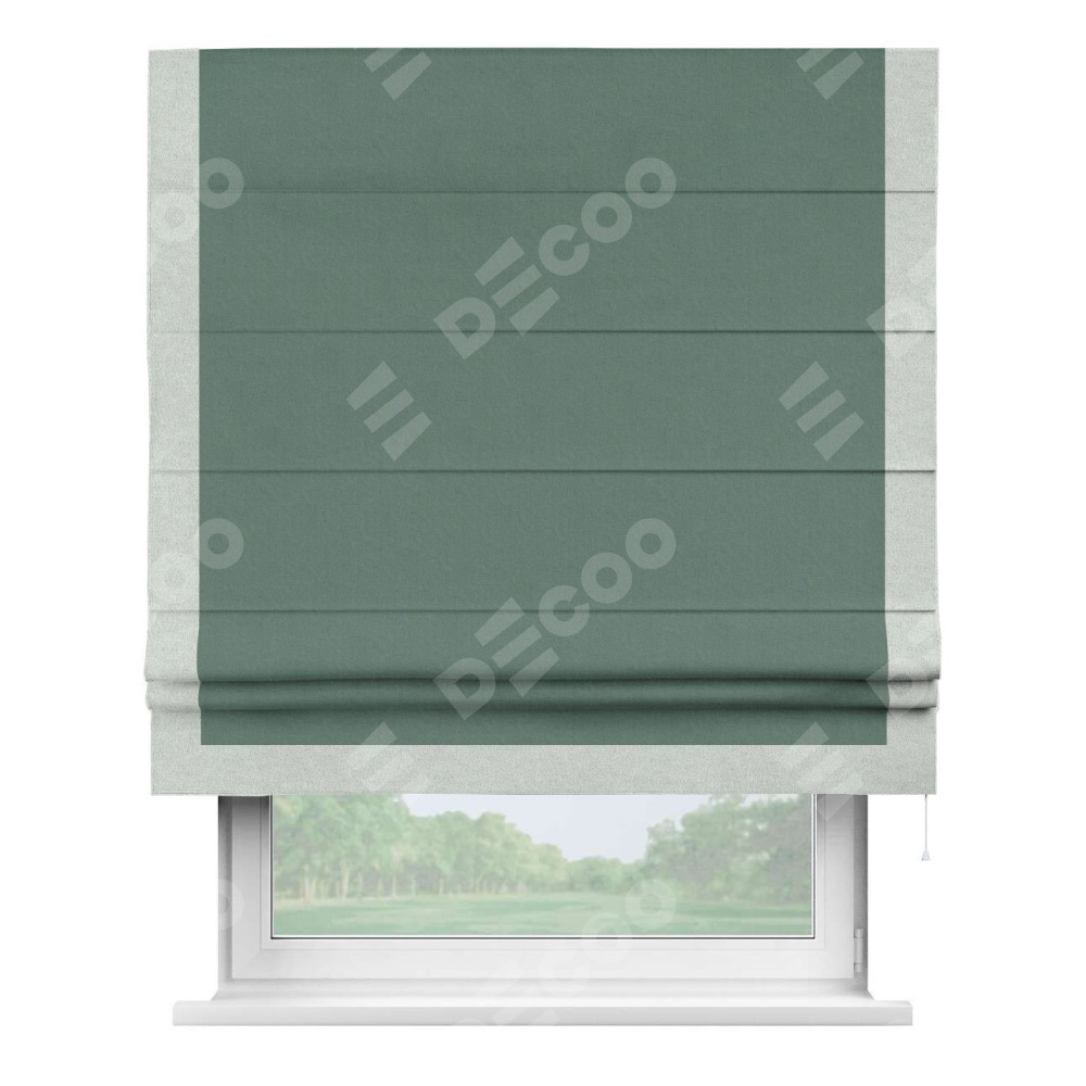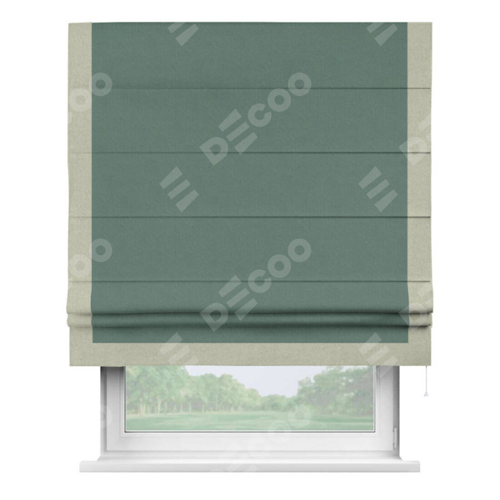 Римская штора производителя «Cortin», используется для проёма, пошита из ткани лён блэкаут бирюзовый, артикул 69517. Отделка шторы кантом «Виктория», ткань для канта используется из льна разной расцветки на выбор. Имеет универсальный механизм и подходит для монтажа: на потолок, на стену и в нишу.