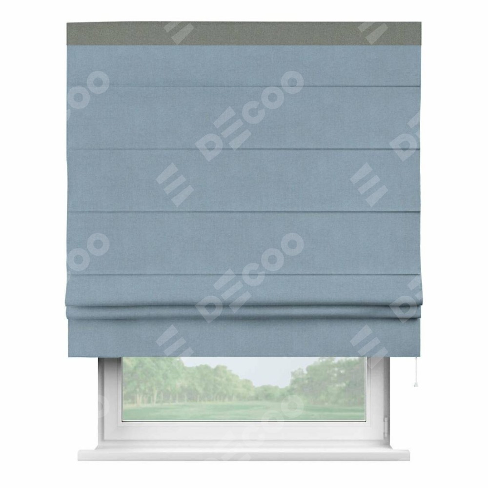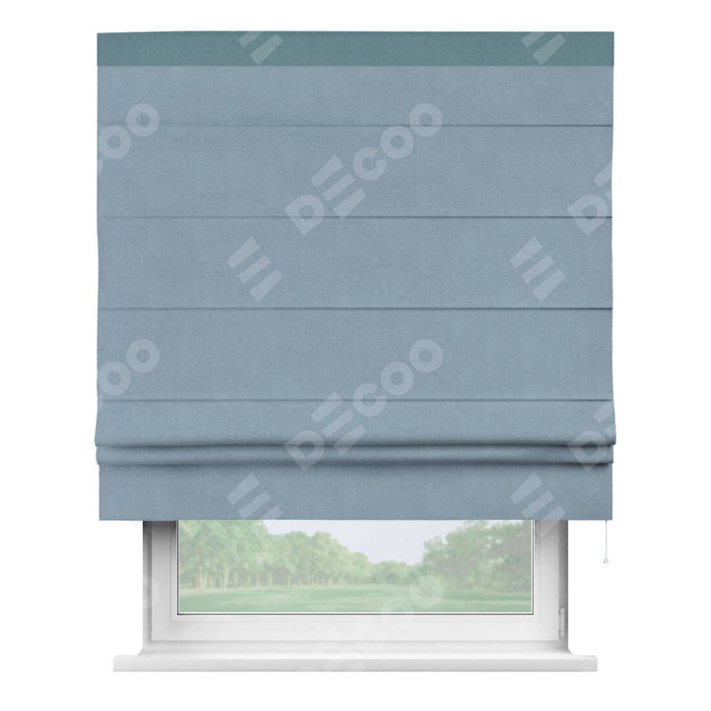 Римская штора производителя «Cortin», используется для проёма, пошита из ткани лён блэкаут голубой, артикул 69574. Отделка шторы кантом «Кинг», ткань для канта используется из льна разной расцветки на выбор. Имеет универсальный механизм и подходит для монтажа: на потолок, на стену и в нишу.