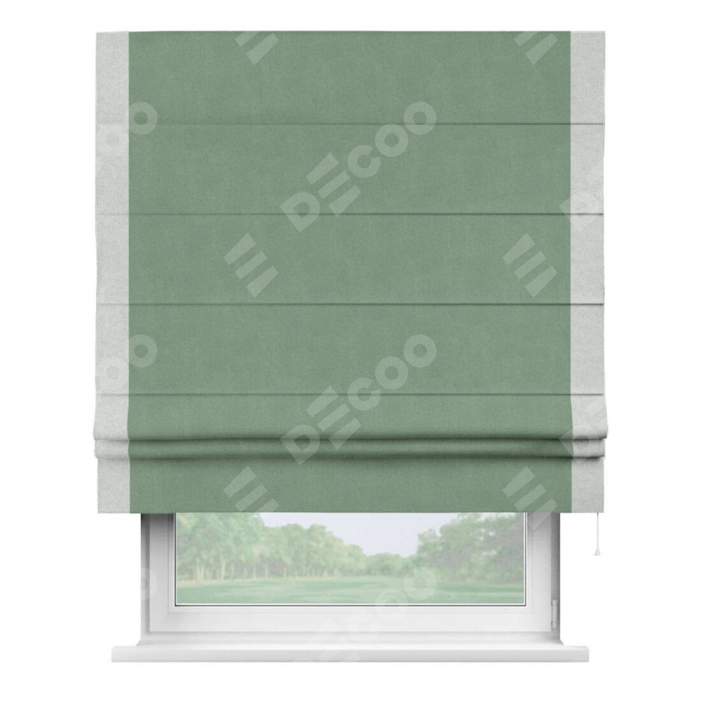 Римская штора производителя «Cortin», используется для проёма, пошита из ткани лён блэкаут светло-бирюзовый, артикул 69443. Отделка шторы кантом «Стрим Дуо», ткань для канта используется из льна разной расцветки на выбор. Имеет универсальный механизм и подходит для монтажа: на потолок, на стену и в нишу.
