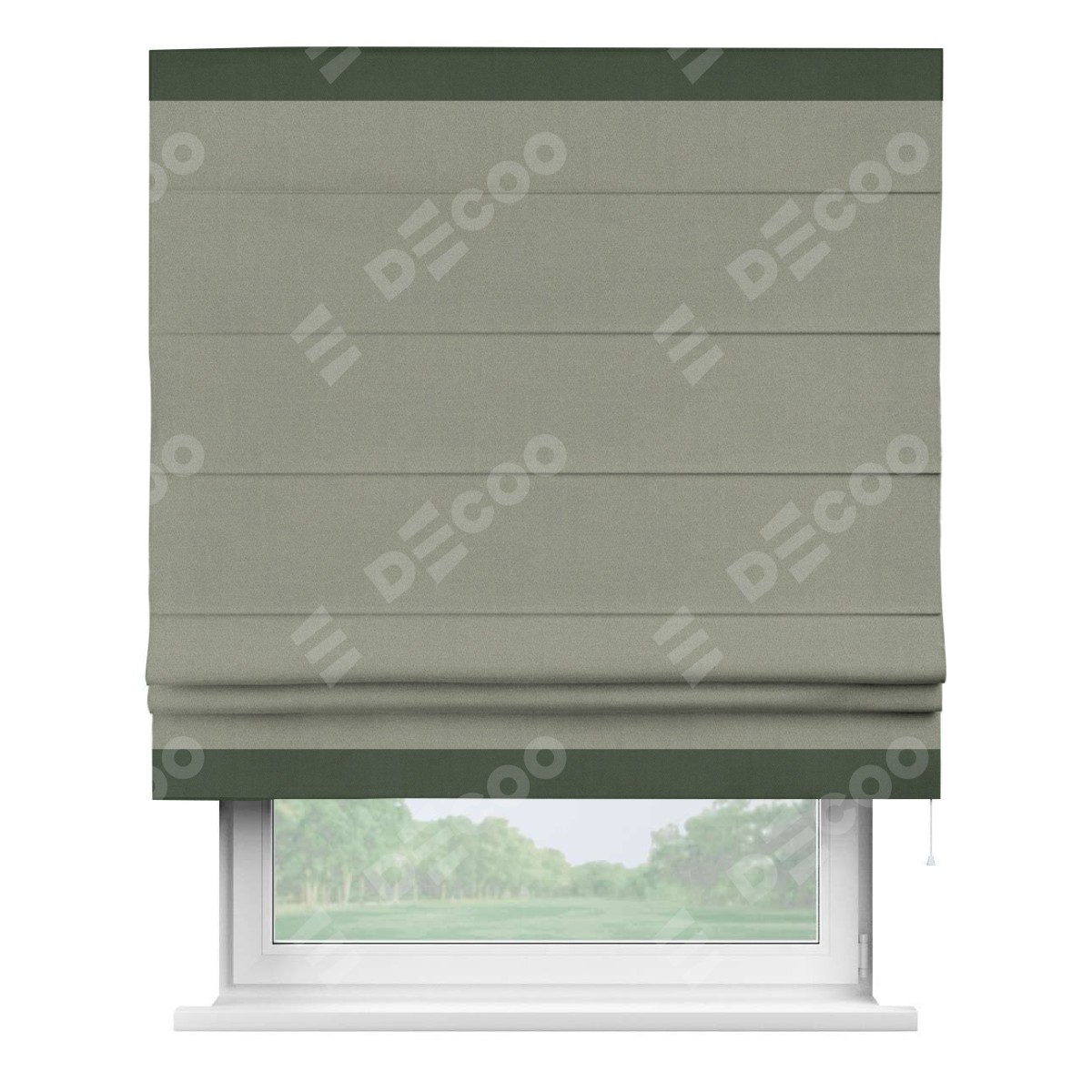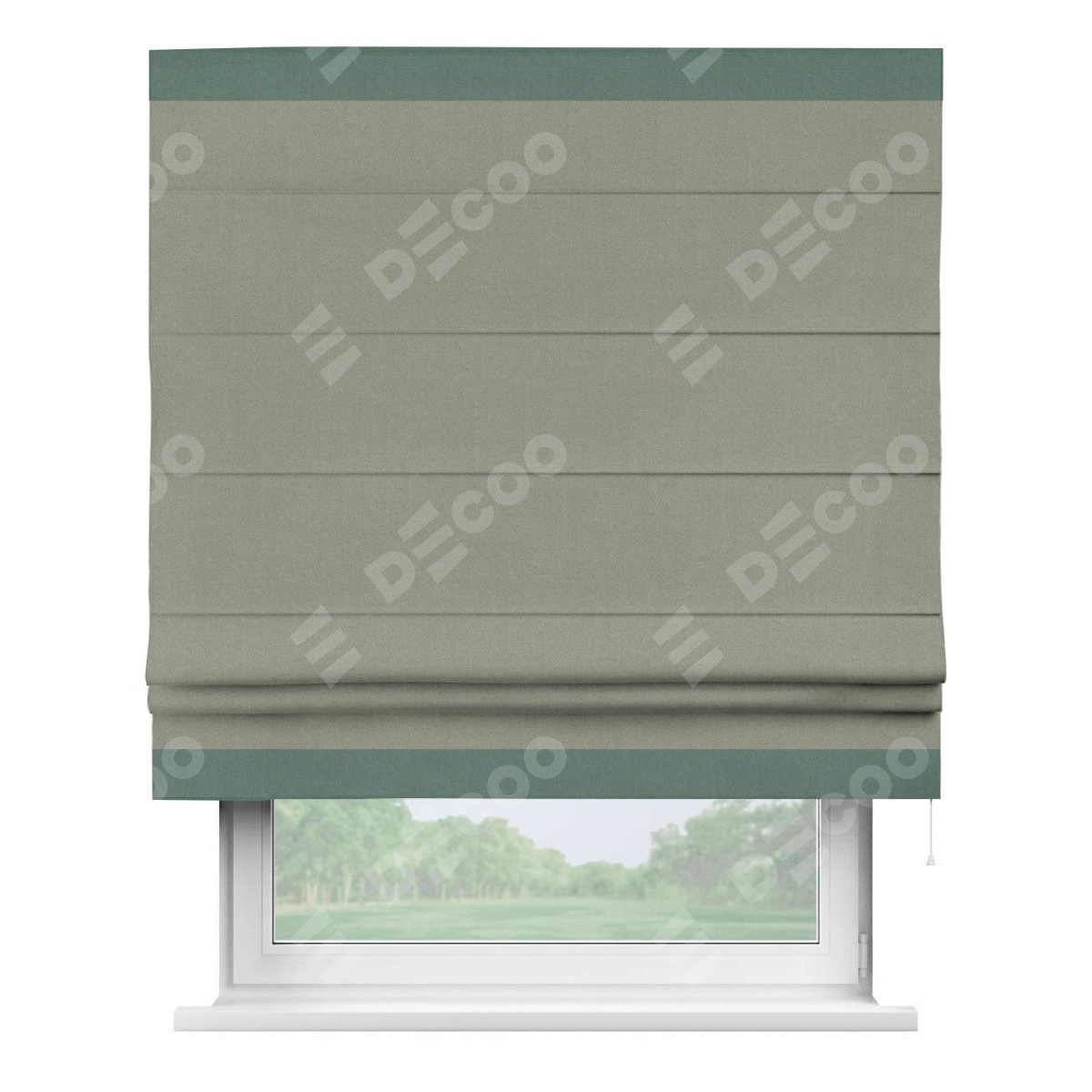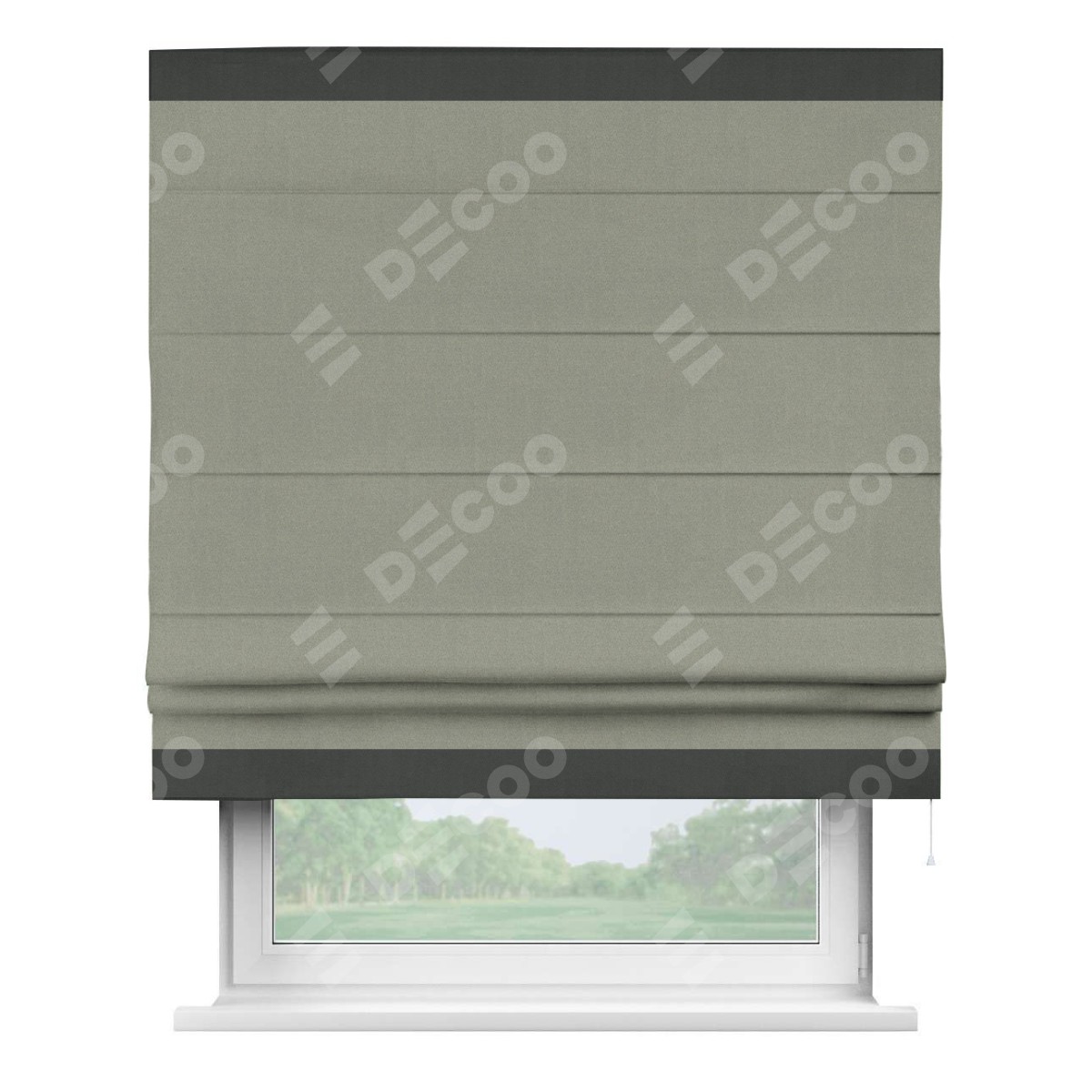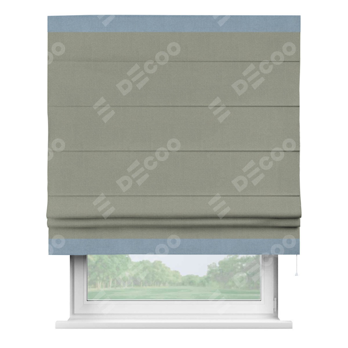 Римская штора производителя «Cortin», используется для проёма, пошита из ткани лён блэкаут светло-серый, артикул 69446. Отделка шторы кантом «Горизонт», ткань для канта используется из льна разной расцветки на выбор. Имеет универсальный механизм и подходит для монтажа: на потолок, на стену и в нишу.