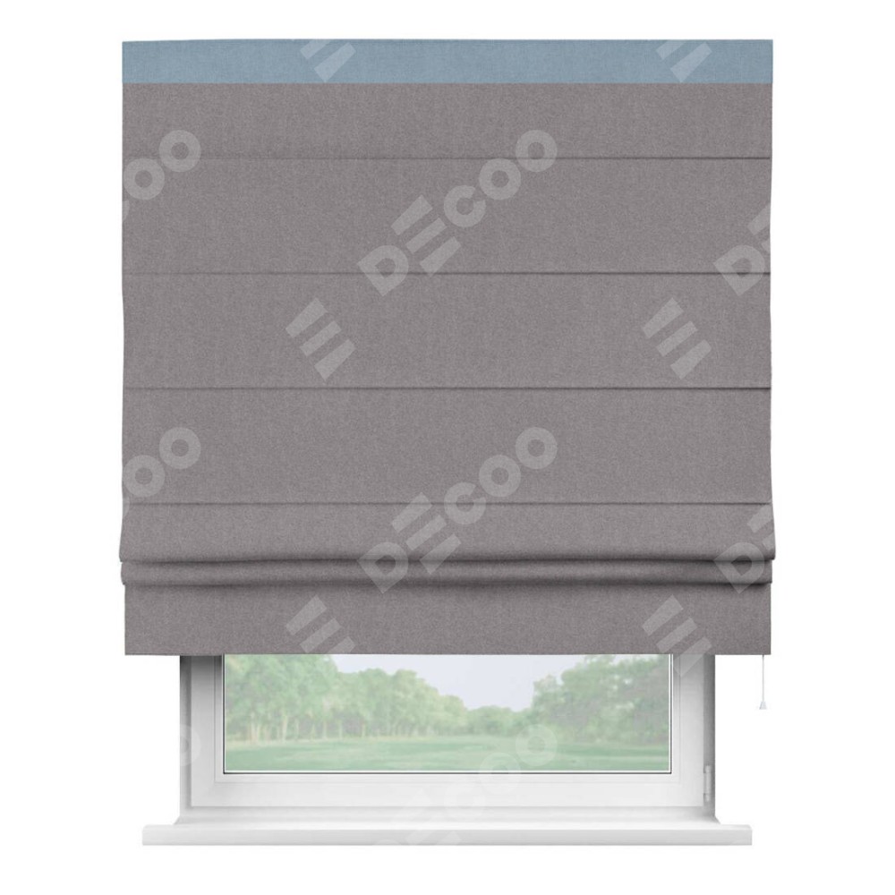 Римская штора производителя «Cortin», используется для проёма, пошита из ткани лён блэкаут сиреневый, артикул 69576. Отделка шторы кантом «Кинг», ткань для канта используется из льна разной расцветки на выбор. Имеет универсальный механизм и подходит для монтажа: на потолок, на стену и в нишу.