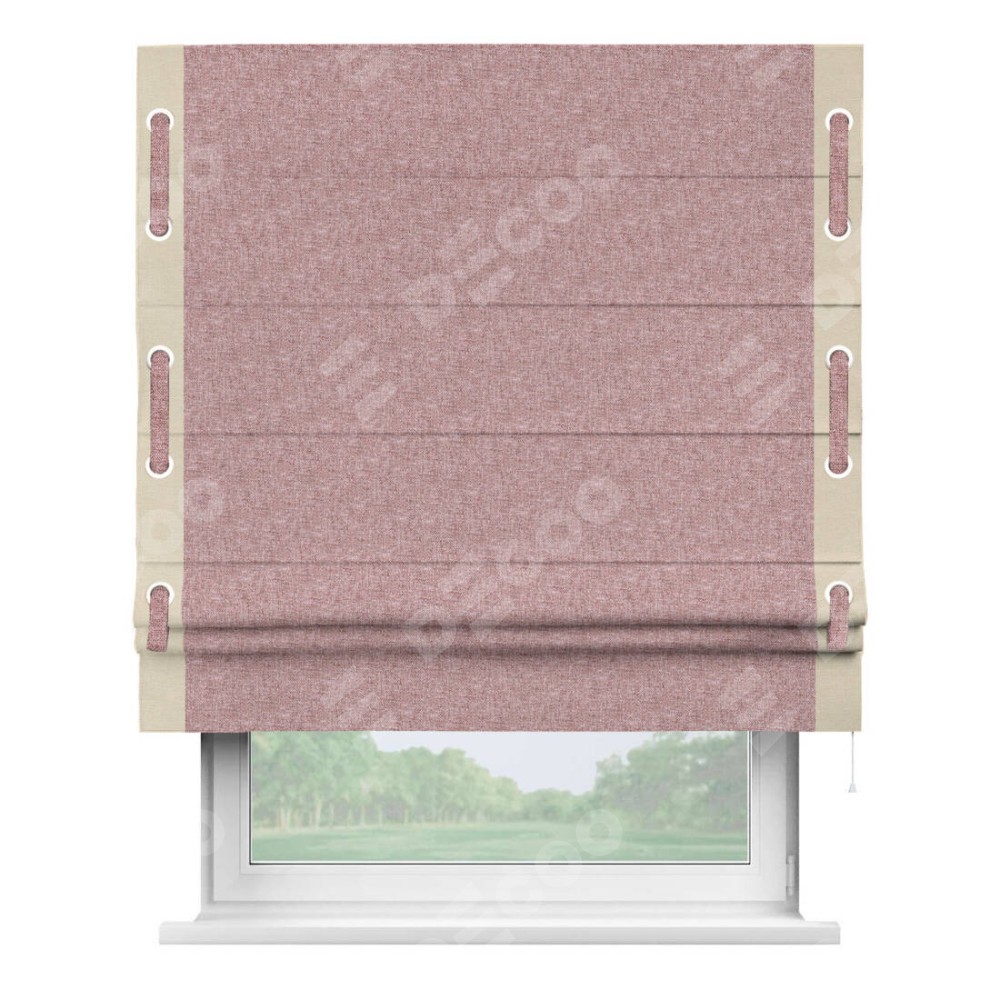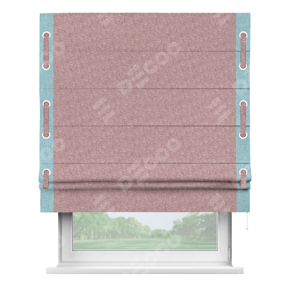 Римская штора производителя «Cortin», используется для проёма, пошита из ткани лён кашемир розовая пудра, артикул 21619. Отделка шторы кантом «Стрим Дуо» на кантах расположены люверсы с пояском, ткань для канта используется из льна разной расцветки на выбор. Ткань для пояска обычно используется из основной ткани шторы, а так же можно сделать из любой расцветки по желанию. Имеет универсальный механизм и подходит для монтажа: на потолок, на стену и в нишу.
