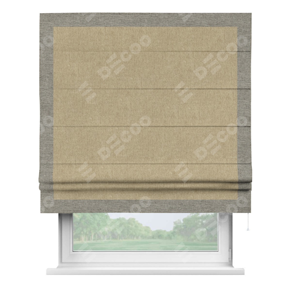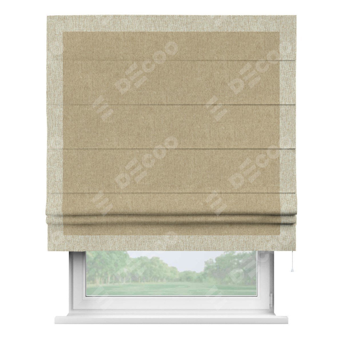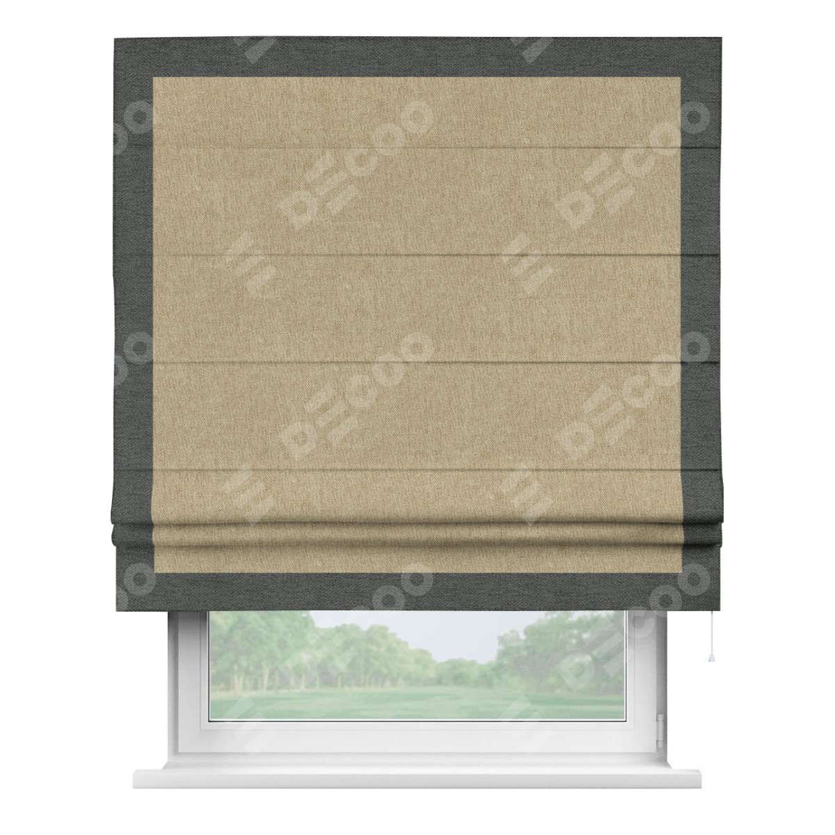 Римская штора производителя «Cortin», используется для проёма, пошита из ткани стиф димаут бежевый, артикул 18083. Отделка шторы кантом «Чесс», ткань для канта используется из стифа разной расцветки на выбор. Имеет универсальный механизм и подходит для монтажа: на потолок, на стену и в нишу.