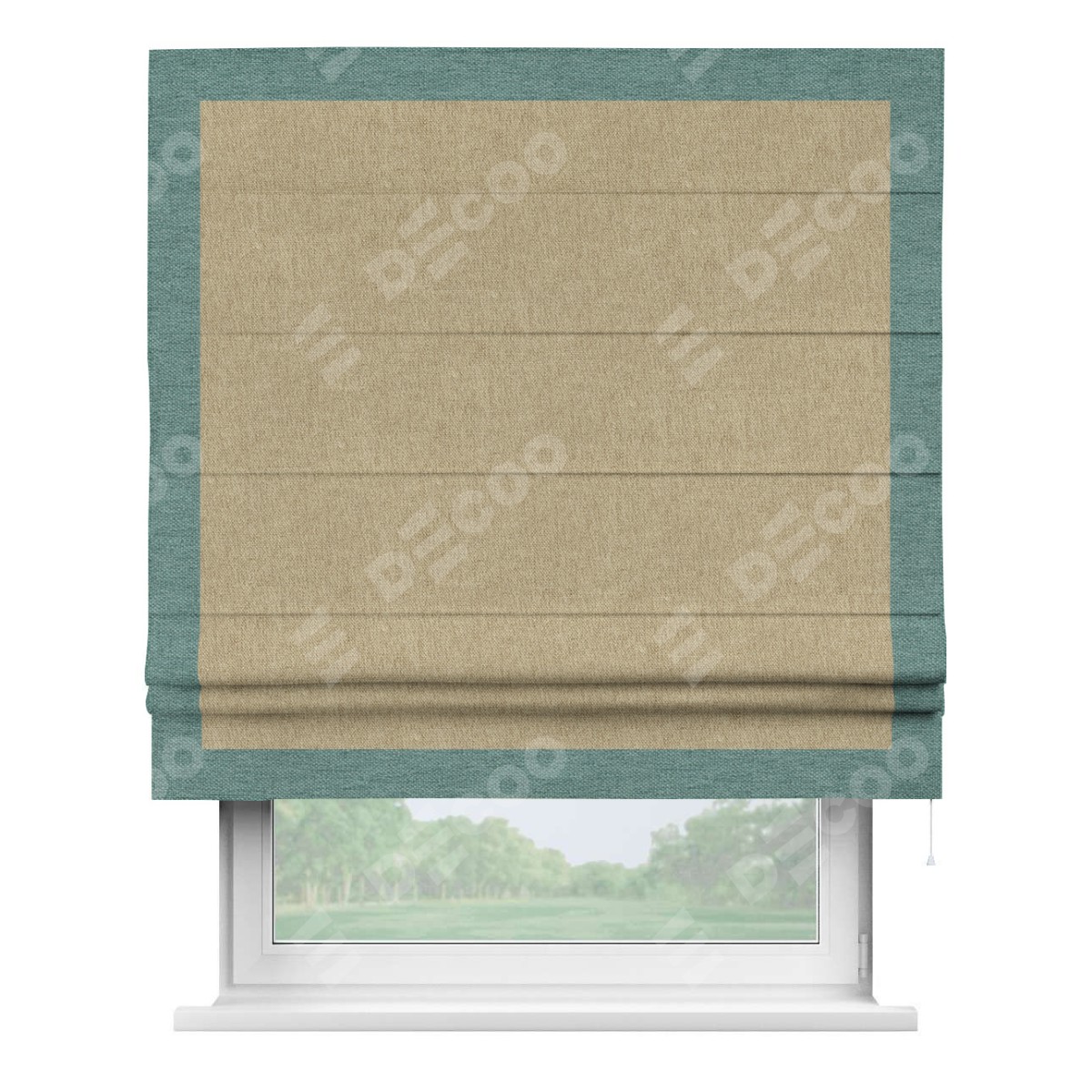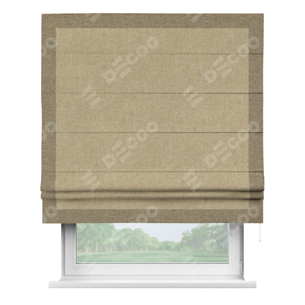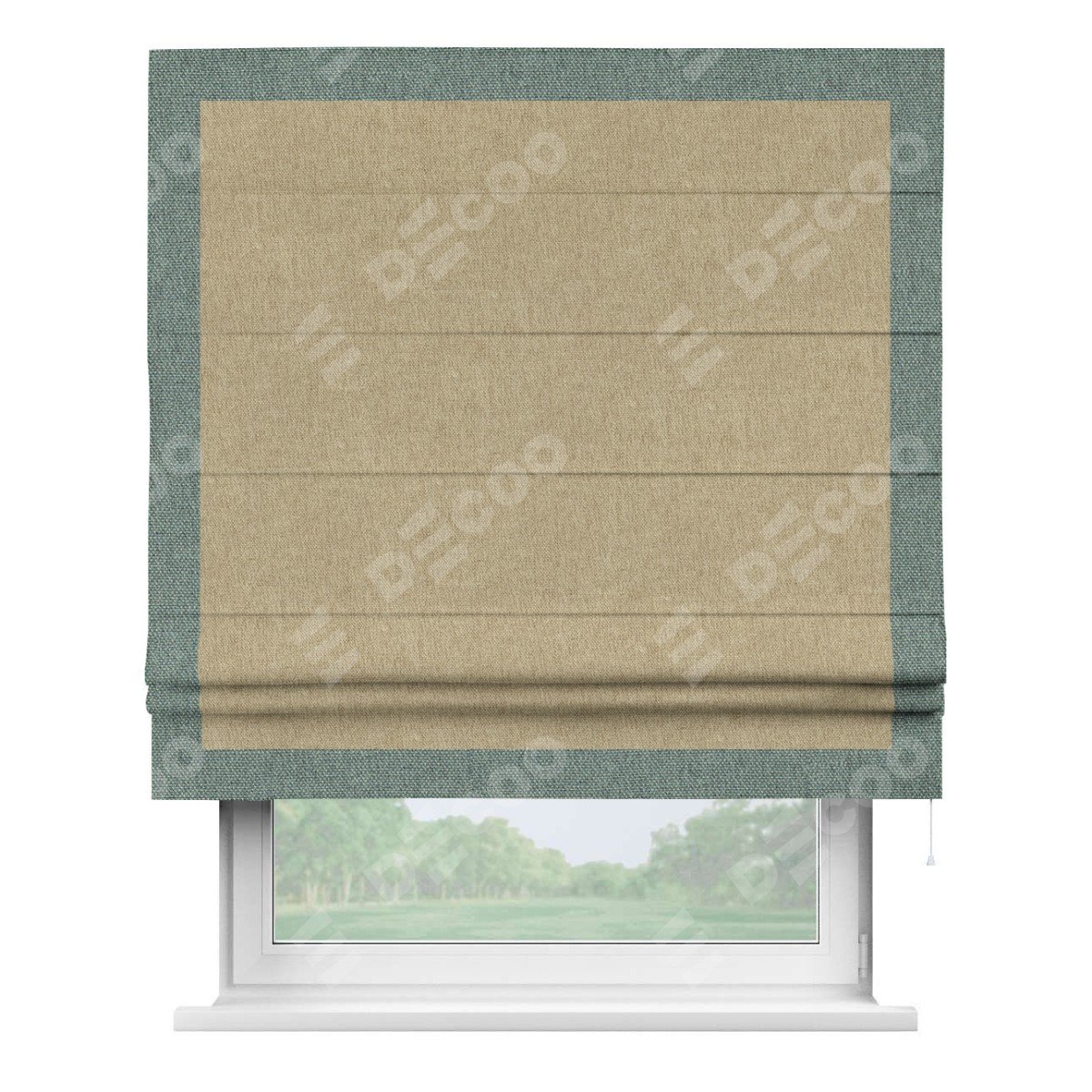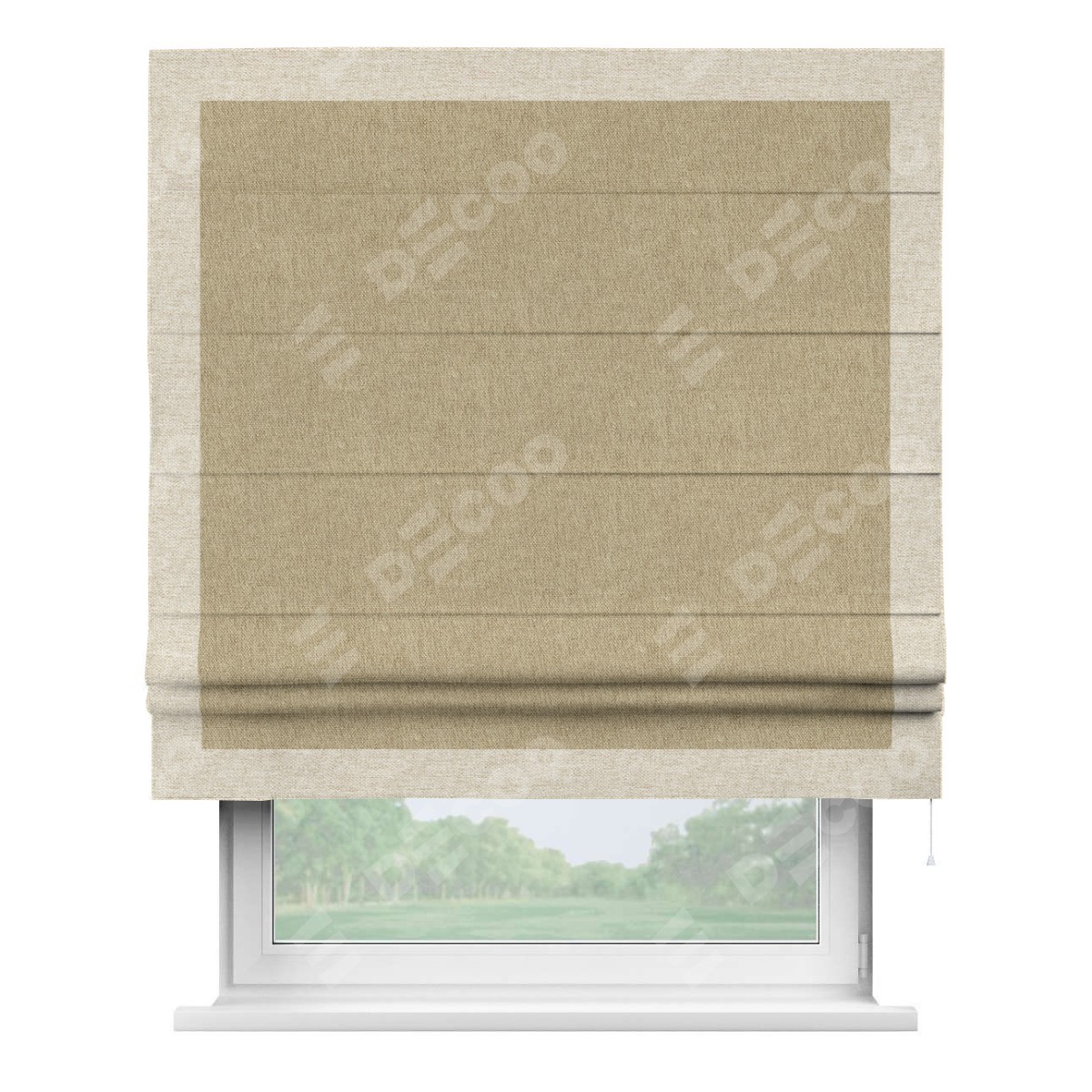 Римская штора производителя «Cortin», используется для проёма, пошита из ткани стиф димаут бежевый, артикул 18083. Отделка шторы кантом «Чесс», ткань для канта используется из стифа разной расцветки на выбор. Имеет универсальный механизм и подходит для монтажа: на потолок, на стену и в нишу.