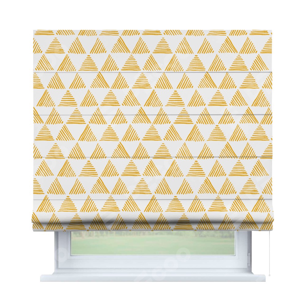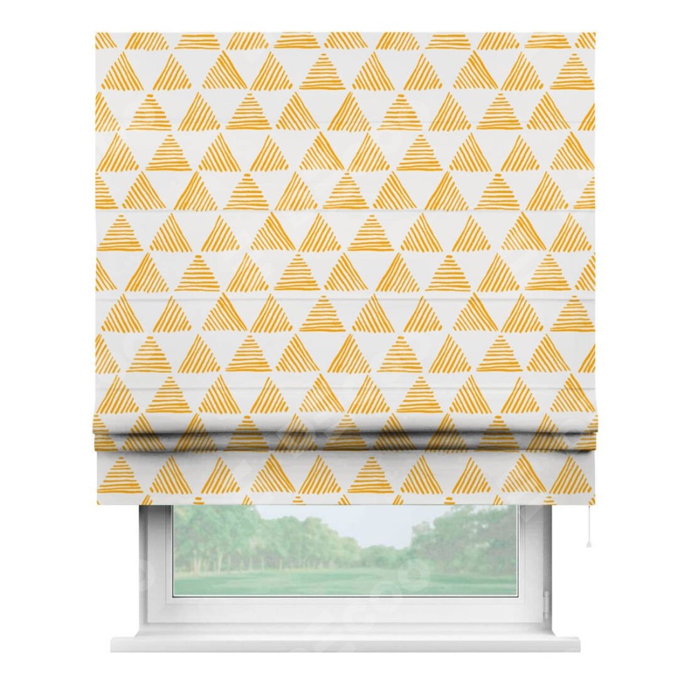 Римская штора производителя «Cortin», используется для проёма, пошита из ткани блэкаут с нанесением сублимационной печати «Желтые треугольники». Имеет универсальный механизм и подходит для монтажа: на потолок, на стену и в нишу.