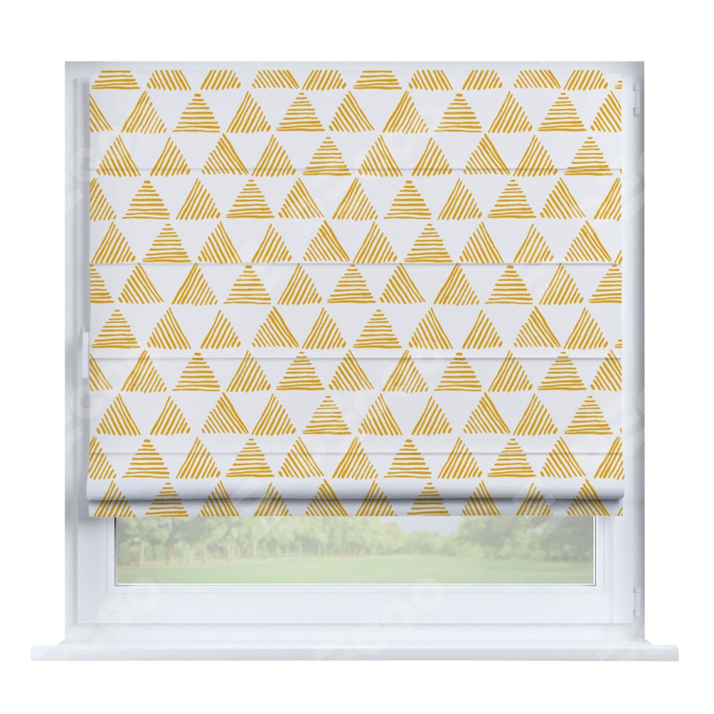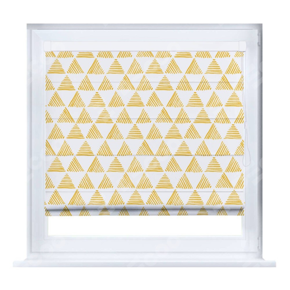 Римская штора производителя «Cortin», устанавливается на створку окна, пошита из ткани блэкаут с нанесением сублимационной печати «Желтые треугольники». Штора шьётся по индивидуальным размерам, для данного типа римской шторы возможная ширина от 35 до 150 см., высота до 250 см.
