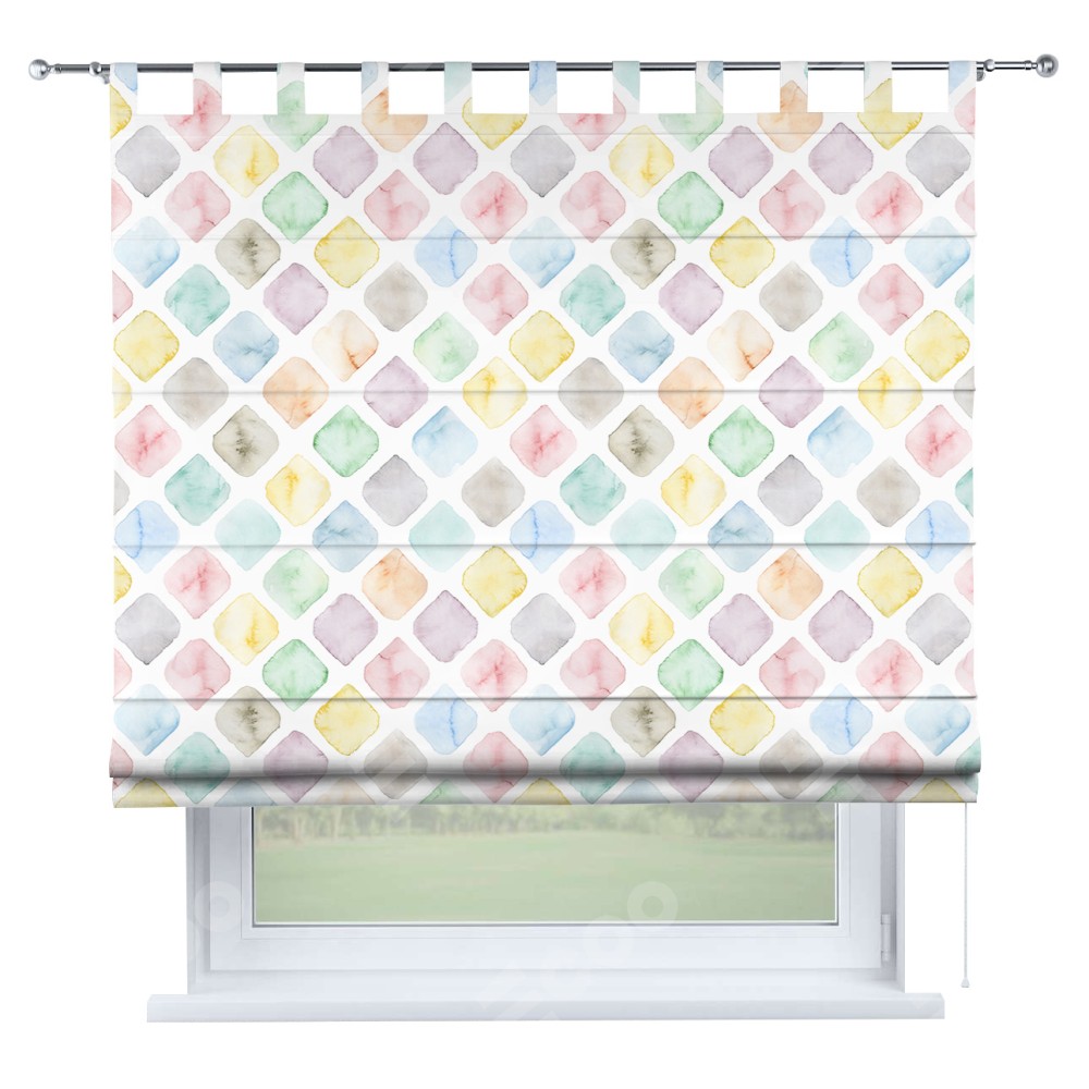 Римская штора производителя «Cortin», используется для проёма, пошита из ткани блэкаут с нанесением сублимационной печати «Мозаика акварель». Данная модель пошита на петлях, комплектуется на выбор круглым карнизом и подходит для монтажа на стену. Римская штора на петлях имеет простую систему регулировки высоты, отличительным преимуществом данной модели является простой способ монтажа. Достаточно повесить ее на трубу и штора готова!