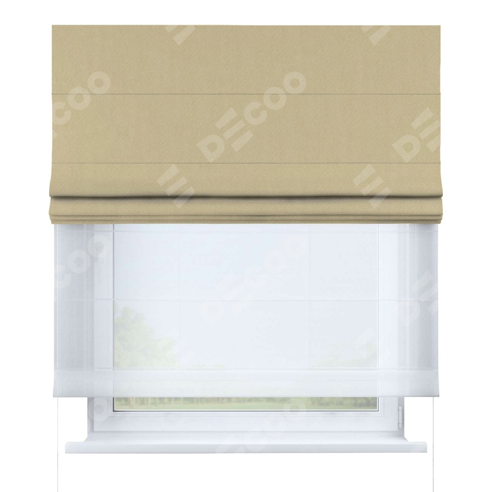 Римская штора день-ночь производителя «Cortin», используется для проёма, пошита из двух полотен, с лицевой стороны канвас бежевый артикул v-96, вторая ткань тюль (по стандарту комплектуется тюль белого цвета артикул V-01). Имеет универсальный механизм и подходит для монтажа: на потолок, на стену и в нишу.