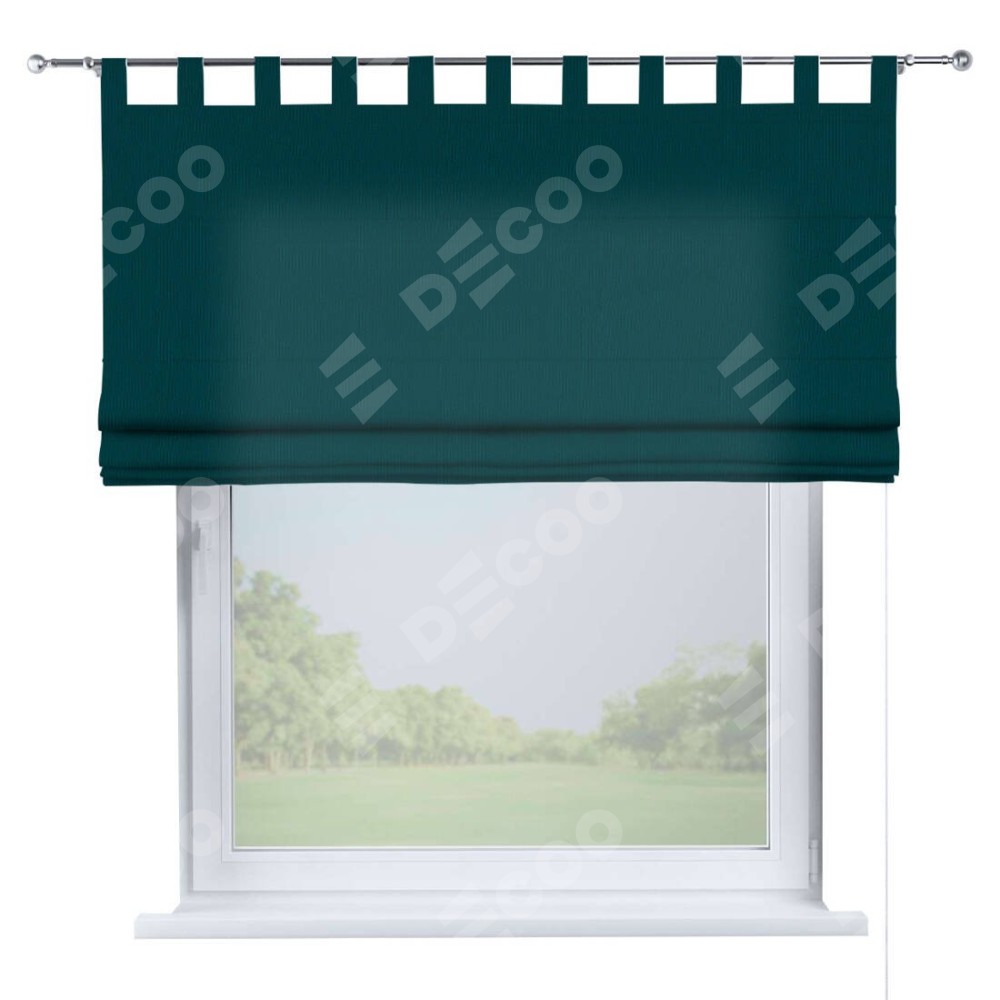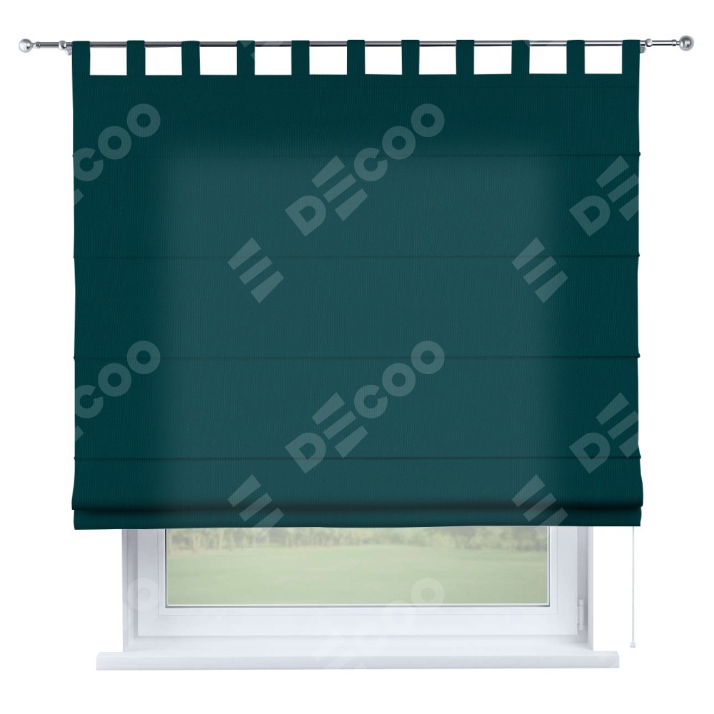 Римская штора производителя «Cortin», используется для проёма, пошита из ткани канвас изумрудный, артикул ткани v-12487. Данная модель пошита на петлях, комплектуется на выбор круглым карнизом и подходит для монтажа на стену. Римская штора на петлях имеет простую систему регулировки высоты, отличительным преимуществом данной модели является простой способ монтажа. Достаточно повесить ее на трубу и штора готова!