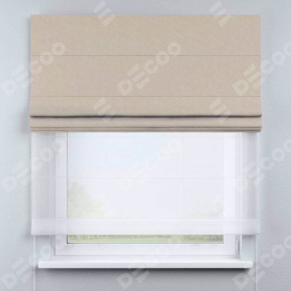 Римская штора день-ночь производителя «Cortin», используется для проёма, пошита из двух полотен, с лицевой стороны канвас кофе с молоком артикул v-07, вторая ткань тюль (по стандарту комплектуется тюль белого цвета артикул V-01). Имеет универсальный механизм и подходит для монтажа: на потолок, на стену и в нишу.