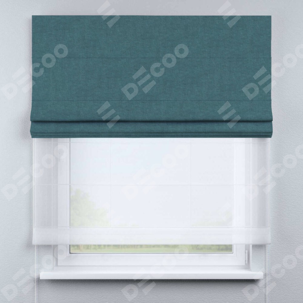Римская штора день-ночь производителя «Cortin», используется для проёма, пошита из двух полотен, с лицевой стороны канвас ментоловый артикул v-114, вторая ткань тюль (по стандарту комплектуется тюль белого цвета артикул V-01). Имеет универсальный механизм и подходит для монтажа: на потолок, на стену и в нишу.