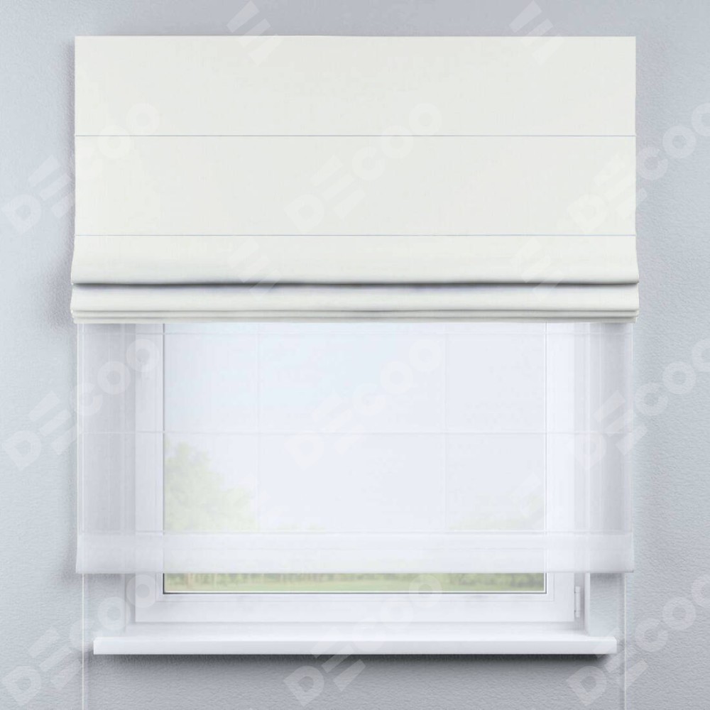Римская штора день-ночь производителя «Cortin», используется для проёма, пошита из двух полотен, с лицевой стороны канвас молочный артикул v-93, вторая ткань тюль (по стандарту комплектуется тюль белого цвета артикул V-01). Имеет универсальный механизм и подходит для монтажа: на потолок, на стену и в нишу.