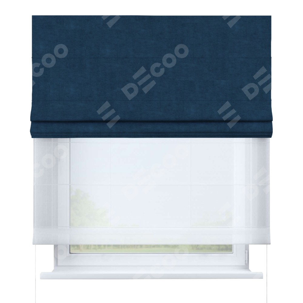 Римская штора день-ночь производителя «Cortin», используется для проёма, пошита из двух полотен, с лицевой стороны канвас синий артикул v-573, вторая ткань тюль (по стандарту комплектуется тюль белого цвета артикул V-01). Имеет универсальный механизм и подходит для монтажа: на потолок, на стену и в нишу.