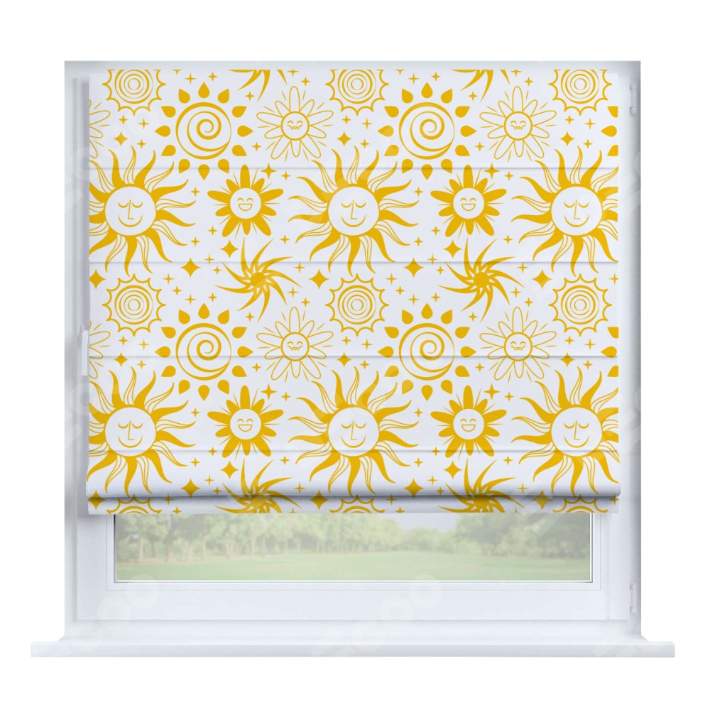 Римская штора производителя «Cortin», устанавливается на створку окна, пошита из ткани блэкаут с нанесением сублимационной печати «Солнышки». Штора шьётся по индивидуальным размерам, для данного типа римской шторы возможная ширина от 35 до 150 см., высота до 250 см.