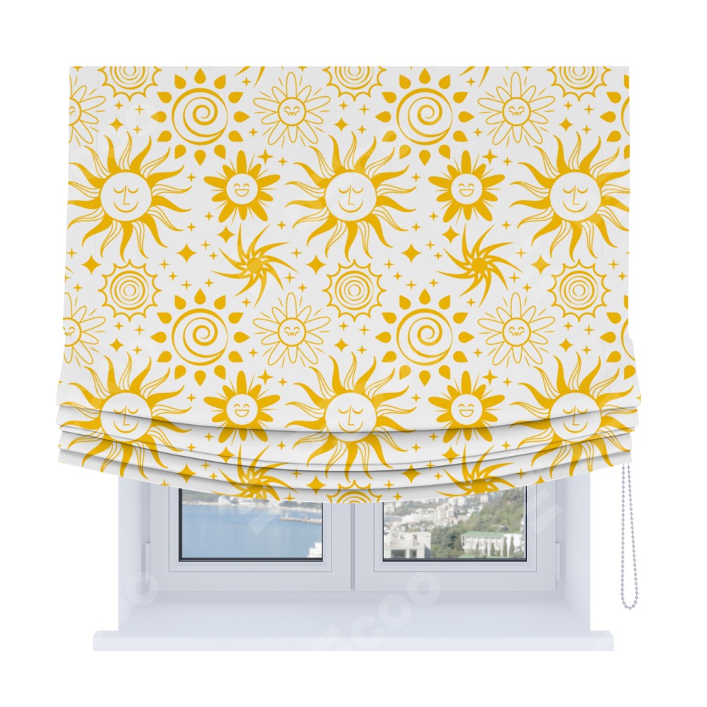 Римская штора Soft производителя «Cortin», используется для проёма, пошита из ткани блэкаут с нанесением сублимационной печати «Солнышки». Имеет универсальный механизм и подходит для монтажа: на потолок, на стену и в нишу. В отличие от стандартных римских штор, римская штора Soft не имеет горизонтальных вставок и нижнего отвеса. Это позволяет ткани произвольно драпироваться в свободные мягкие складки.