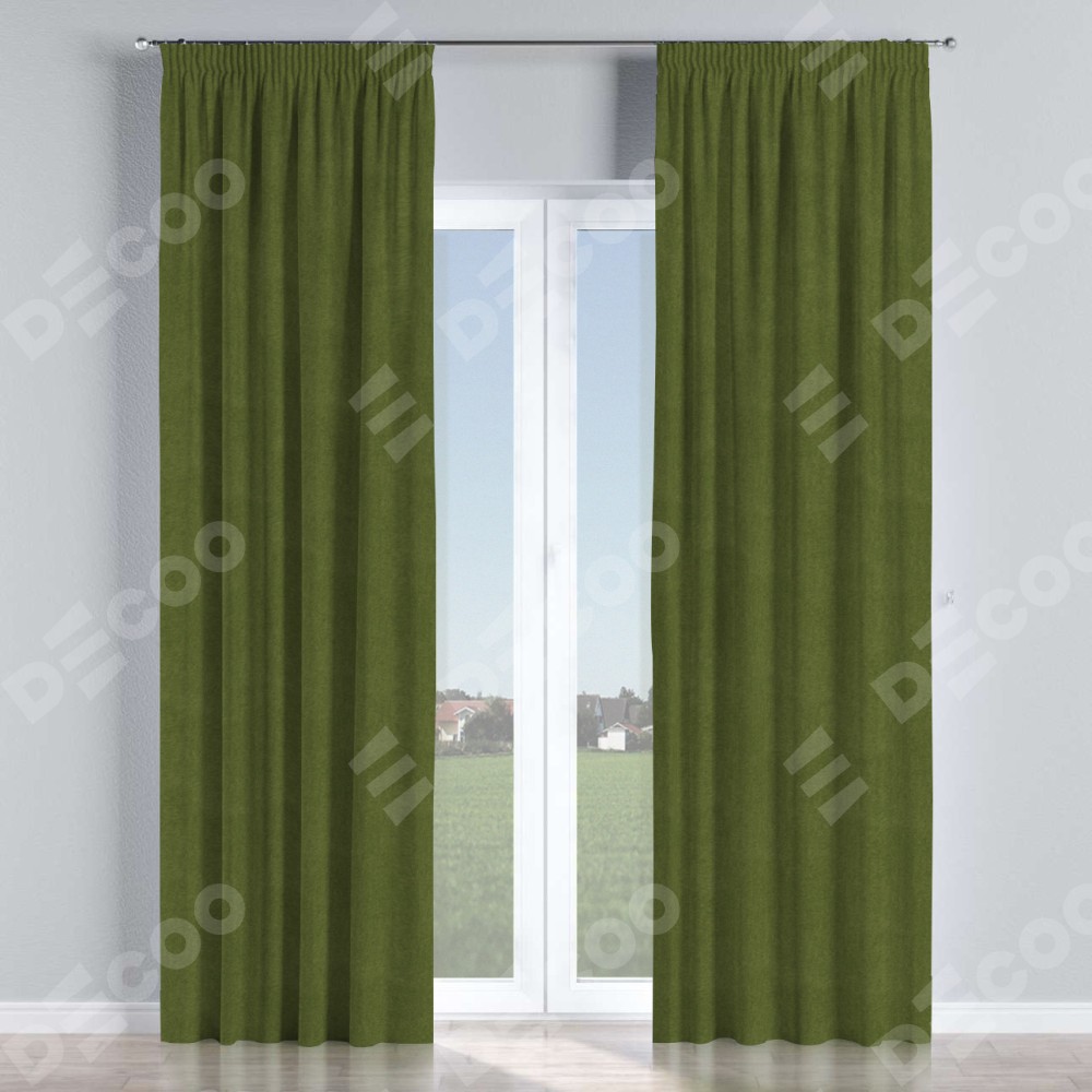 Комплект прямых штор, от производителя «Cortin», пошиты из ткани лён димаут салатовый, артикул ткани 91002. С изнаночной стороны в верхней части штор пристрачивается шторная лента с декоративными складками «Карандаш». Для создания элегантных складок прямые шторы шьются по стандарту с коэффициентом 1:2 (на 100 см. ширины проёма 200 см. ширины ткани).