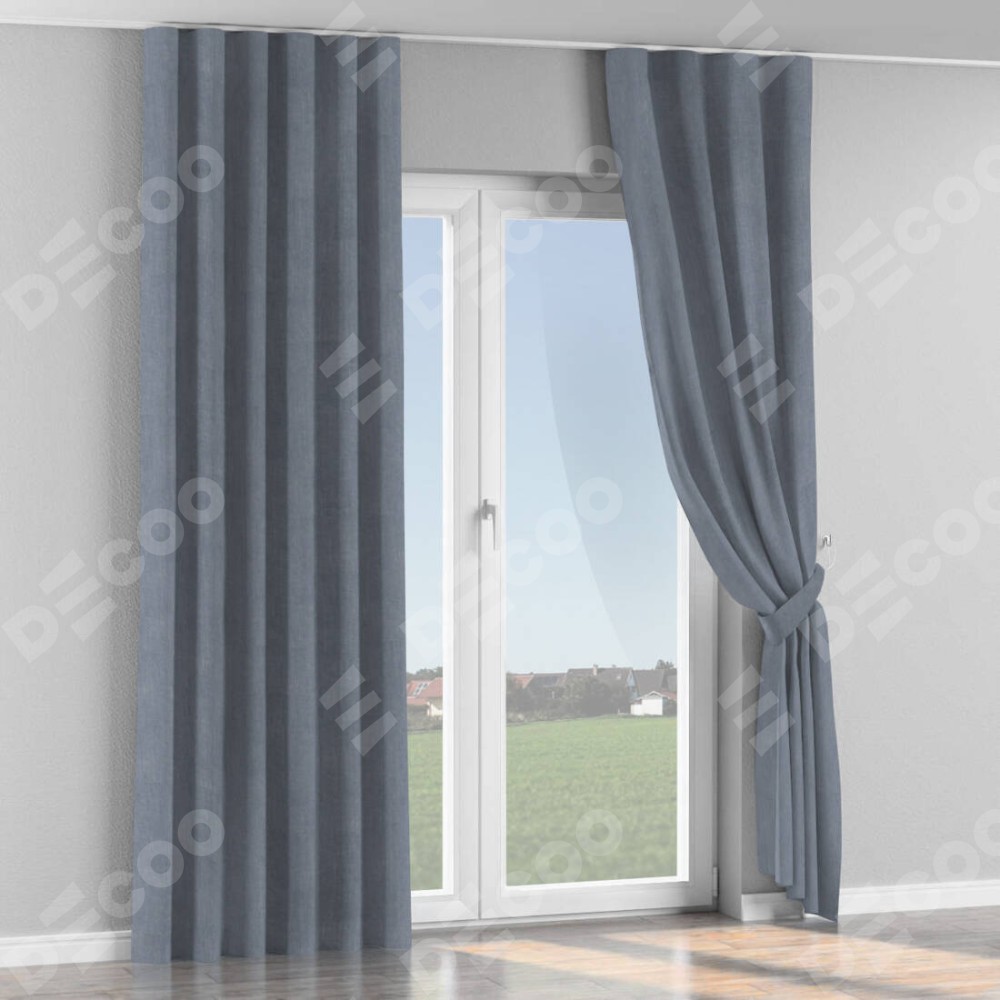 Комплект прямых штор, от производителя «Cortin», пошиты из ткани канвас васильковый, артикул ткани v-203. С изнаночной стороны в верхней части штор пристрачивается шторная лента с декоративными складками «Волна». Для создания элегантных складок прямые шторы шьются по стандарту с коэффициентом 1:2 (на 100 см. ширины проёма 200 см. ширины ткани).