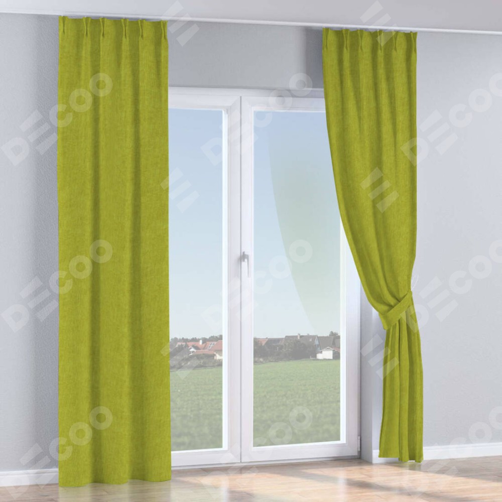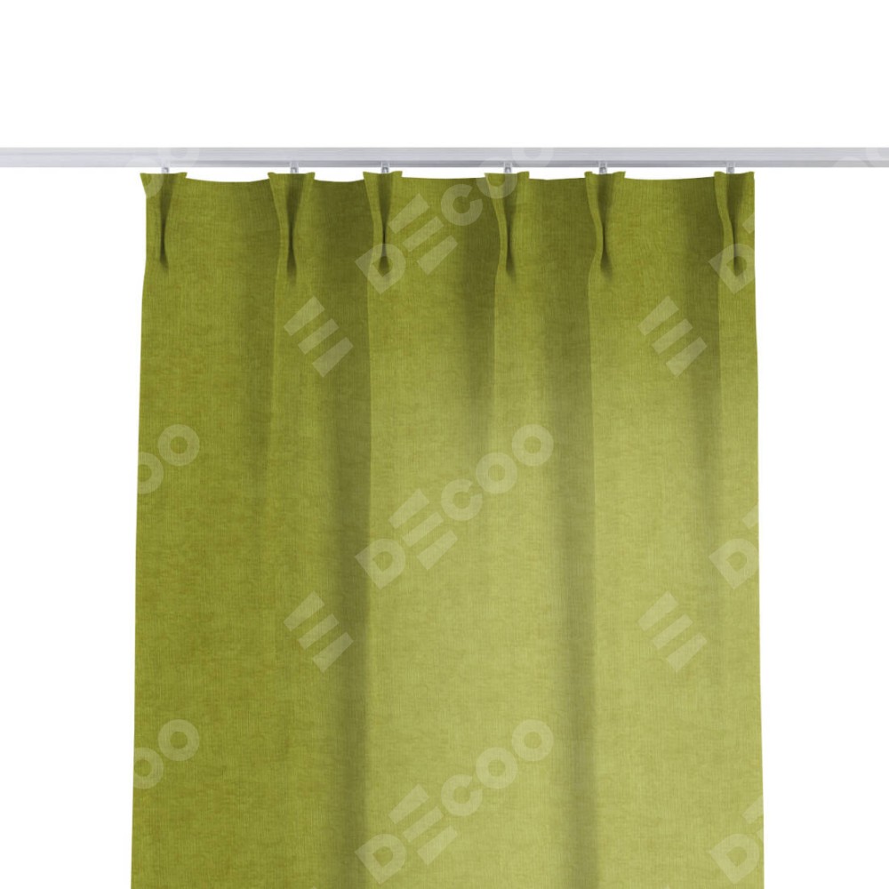 Комплект прямых штор, от производителя «Cortin», пошиты из ткани канвас зелёное яблоко, артикул ткани v-370. С изнаночной стороны в верхней части штор пристрачивается шторная лента с декоративными складками «Кустик». Для создания элегантных складок прямые шторы шьются по стандарту с коэффициентом 1:2 (на 100 см. ширины проёма 200 см. ширины ткани).