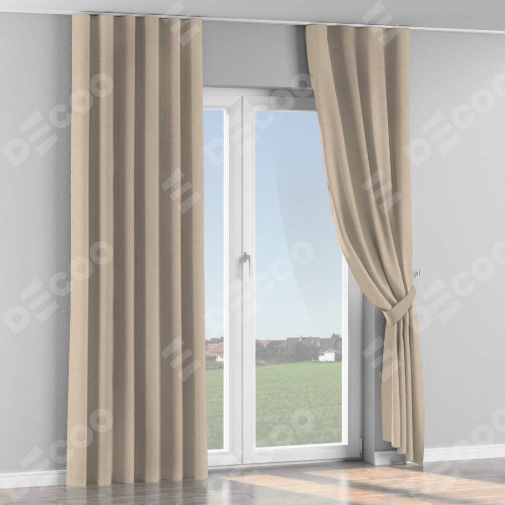 Комплект прямых штор, от производителя «Cortin», пошиты из ткани канвас кофе с молоком, артикул ткани v-07. С изнаночной стороны в верхней части штор пристрачивается шторная лента с декоративными складками «Волна». Для создания элегантных складок прямые шторы шьются по стандарту с коэффициентом 1:2 (на 100 см. ширины проёма 200 см. ширины ткани).