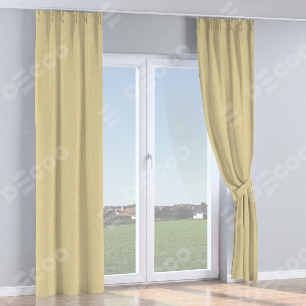 Комплект прямых штор, от производителя «Cortin», пошиты из ткани канвас тёмно-бежевый, артикул ткани v-196. С изнаночной стороны в верхней части штор пристрачивается шторная лента с декоративными складками «Кустик». Для создания элегантных складок прямые шторы шьются по стандарту с коэффициентом 1:2 (на 100 см. ширины проёма 200 см. ширины ткани).