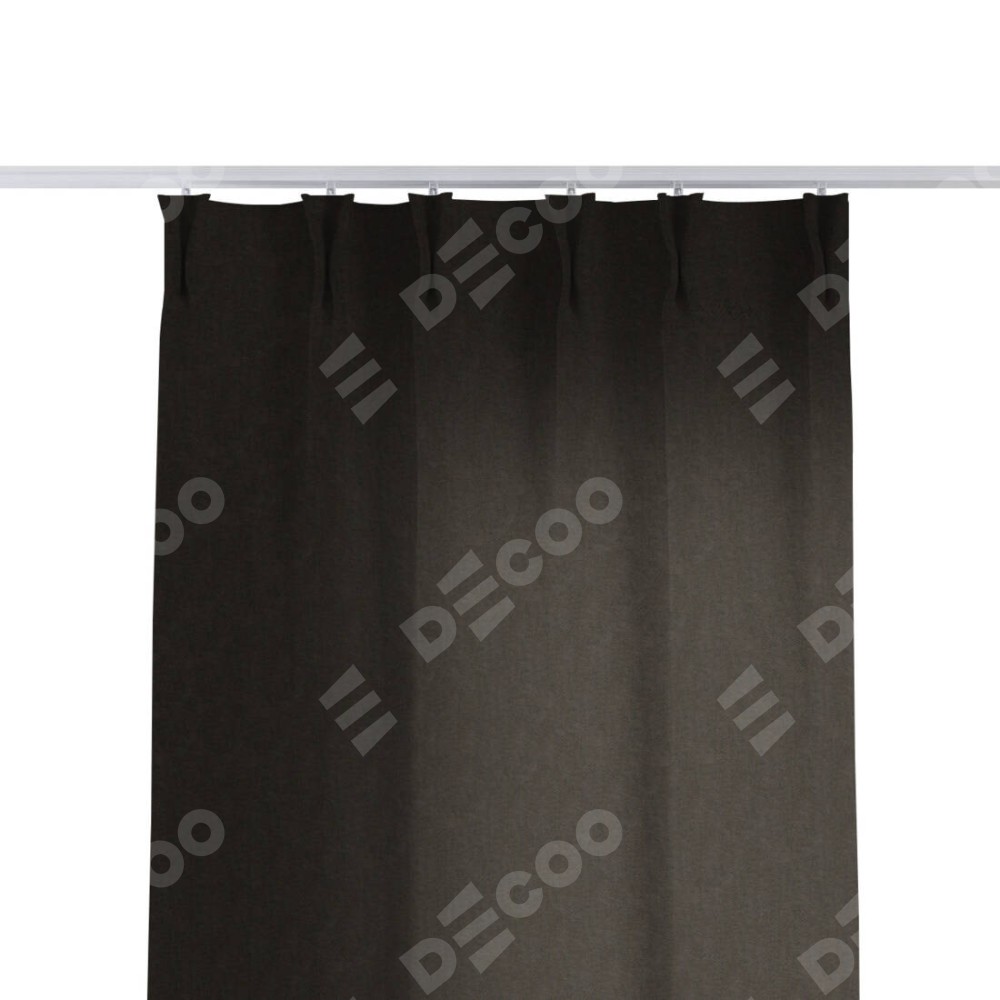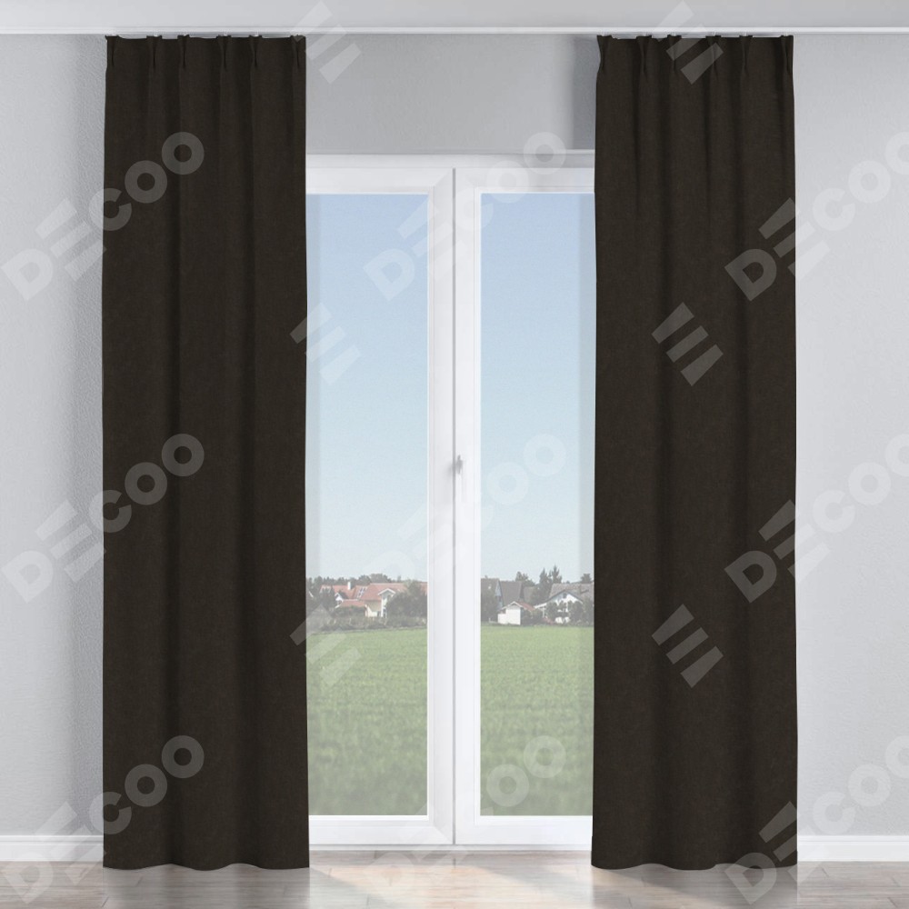 Комплект прямых штор, от производителя «Cortin», пошиты из ткани канвас тёмно-коричневый, артикул ткани v-13. С изнаночной стороны в верхней части штор пристрачивается шторная лента с декоративными складками «Кустик». Для создания элегантных складок прямые шторы шьются по стандарту с коэффициентом 1:2 (на 100 см. ширины проёма 200 см. ширины ткани).