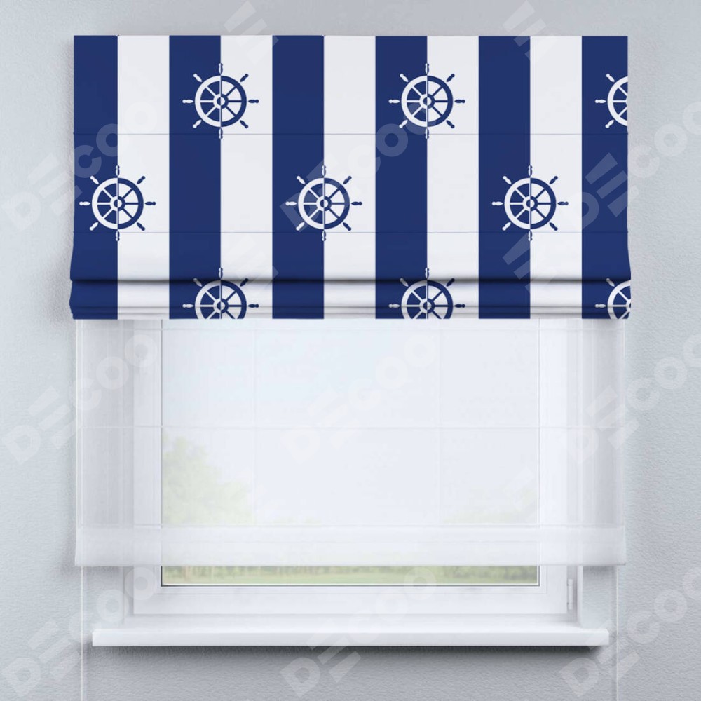 Римская штора день-ночь производителя «Cortin», используется для проёма, пошита из двух полотен, с лицевой блэкаут с нанесением сублимационной печати «Полоски и штурвалы», вторая ткань тюль (по стандарту комплектуется тюль белого цвета артикул V-01). Имеет универсальный механизм и подходит для монтажа: на потолок, на стену и в нишу.
