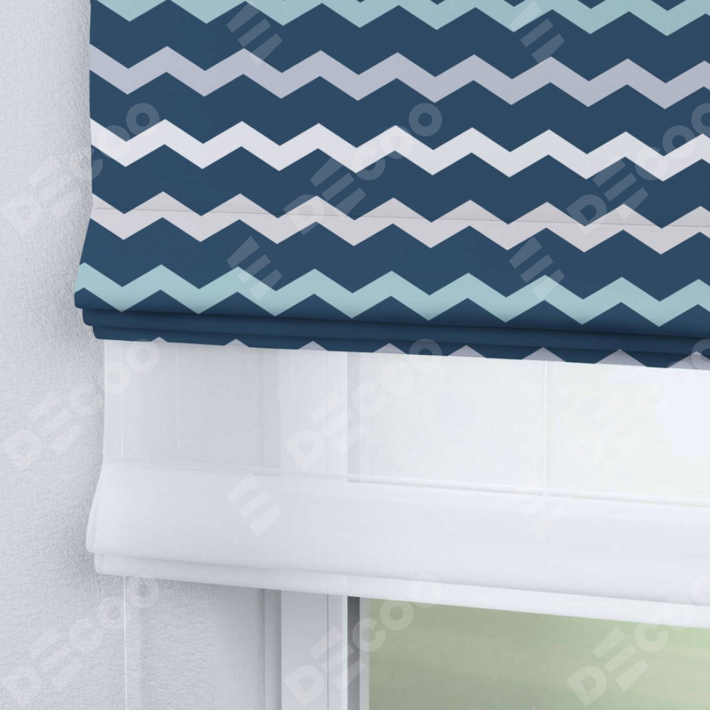 Римская штора день-ночь производителя «Cortin», используется для проёма, пошита из двух полотен, с лицевой блэкаут с нанесением сублимационной печати «Морской шеврон», вторая ткань тюль (по стандарту комплектуется тюль белого цвета артикул V-01). Имеет универсальный механизм и подходит для монтажа: на потолок, на стену и в нишу.