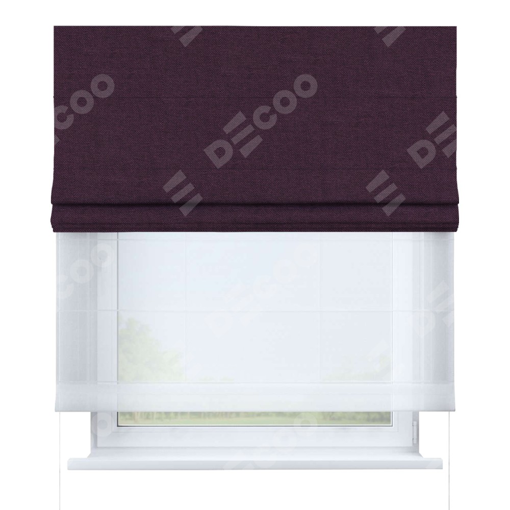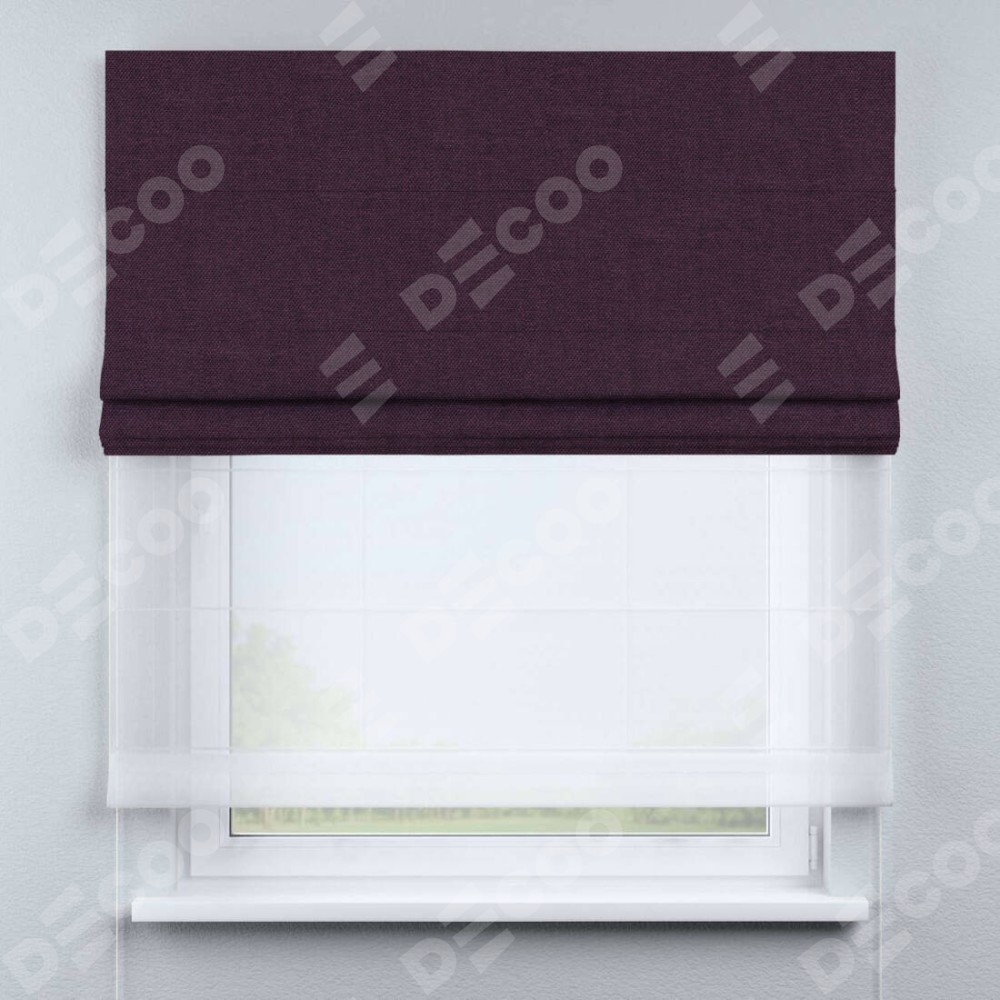 Двойная римская штора «День-ночь» от производителя Cortin предназначена для использования в проёмах. Эта штора уникальна тем, что состоит из двух полотен. На лицевой стороне находится лён димаут фиолетовый (артикул: 16267), обеспечивающий эффективное затемнение. В комплект также входит вторая ткань — легкий белый тюль (артикул: V-01), который добавляет изящества и легкости оформлению окна. Кроме того, доступны и другие разновидности ткани тюль, выбор которых доступен по ссылке .