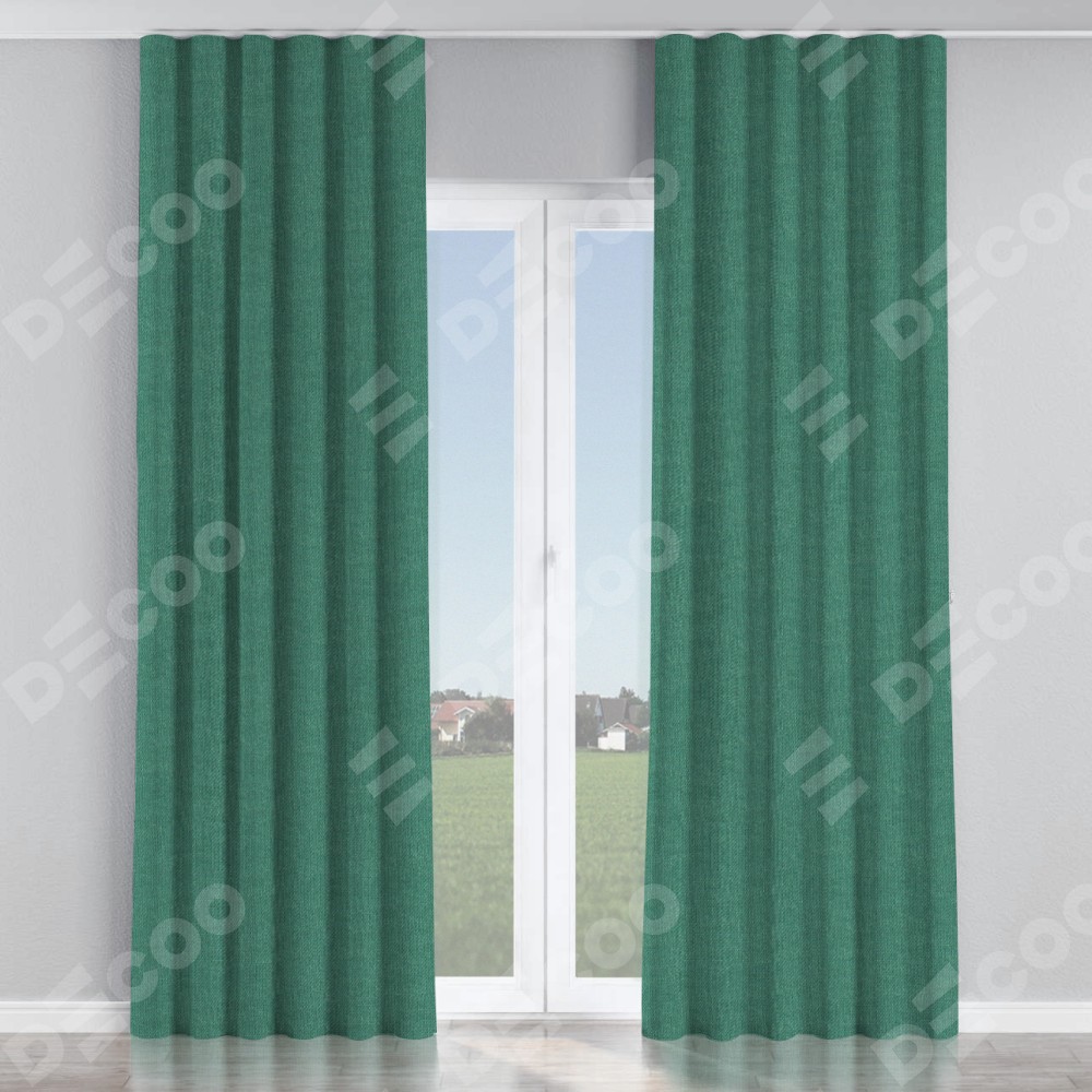 Комплект прямых штор, от производителя «Cortin», пошиты из ткани лён димаут светло-бирюзовый, артикул ткани 91005. С изнаночной стороны в верхней части штор пристрачивается шторная лента с декоративными складками «Волна». Для создания элегантных складок прямые шторы шьются по стандарту с коэффициентом 1:2 (на 100 см. ширины проёма 200 см. ширины ткани).