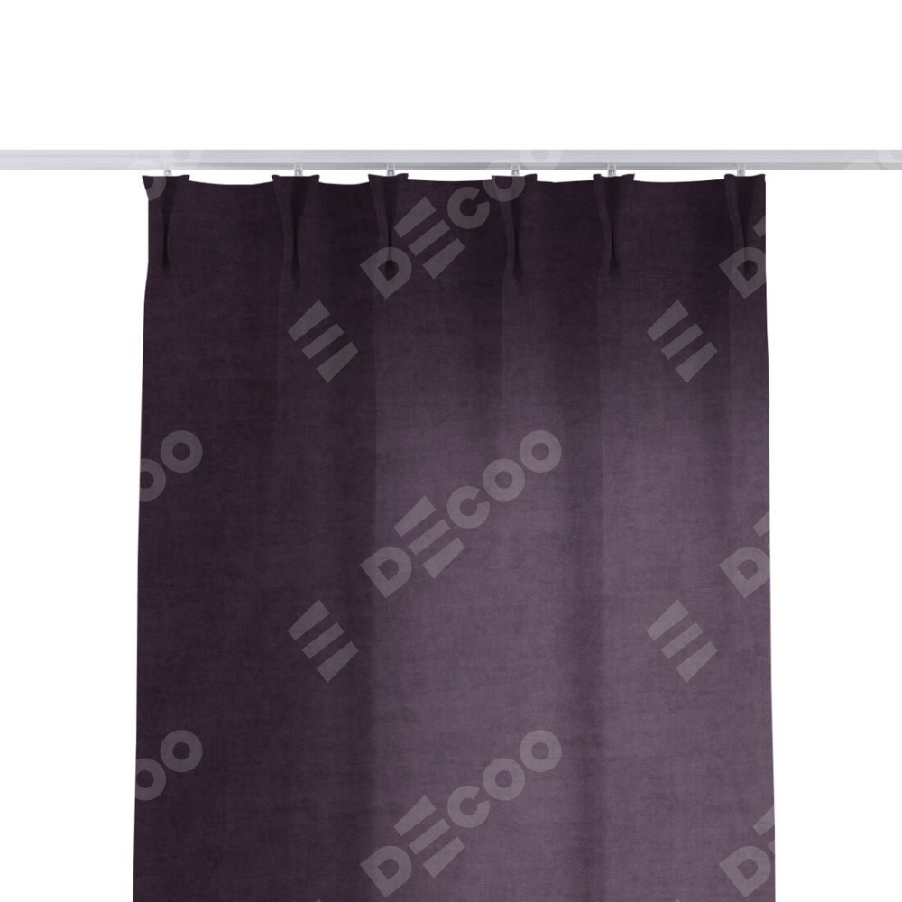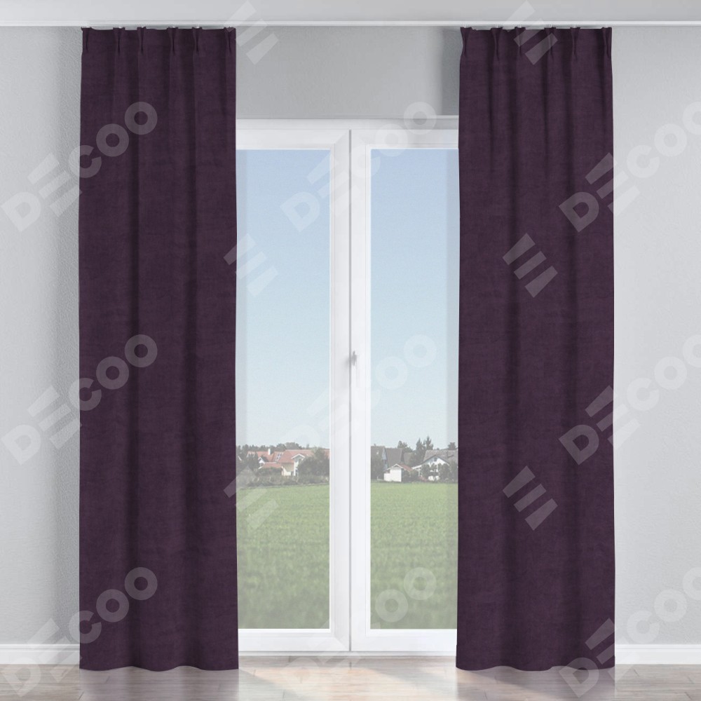 Комплект прямых штор, от производителя «Cortin», пошиты из ткани вельвет тёмно-фиолетовый, артикул ткани 72403. С изнаночной стороны в верхней части штор пристрачивается шторная лента с декоративными складками «Кустик». Для создания элегантных складок прямые шторы шьются по стандарту с коэффициентом 1:2 (на 100 см. ширины проёма 200 см. ширины ткани).