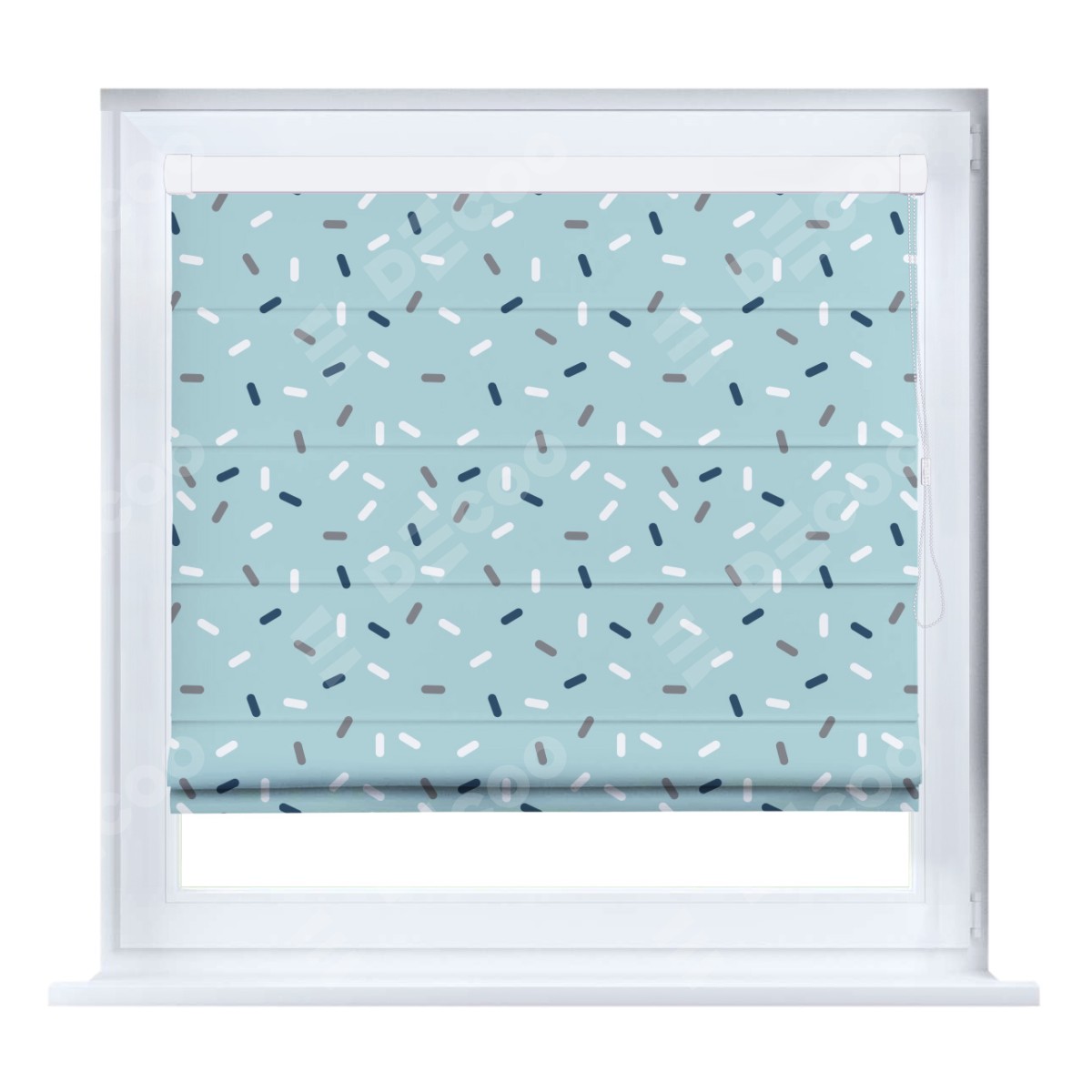 Римская штора кассетного типа, производителя «Cortin», устанавливается только на пластиковые окна и прилегает к стеклопакету, пошита из ткани блэкаут с нанесением сублимационной печати «Короткие линии».