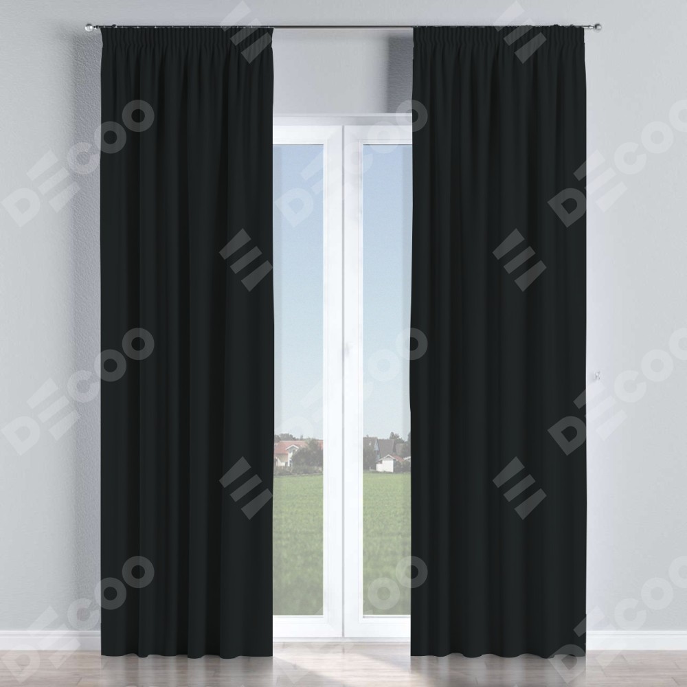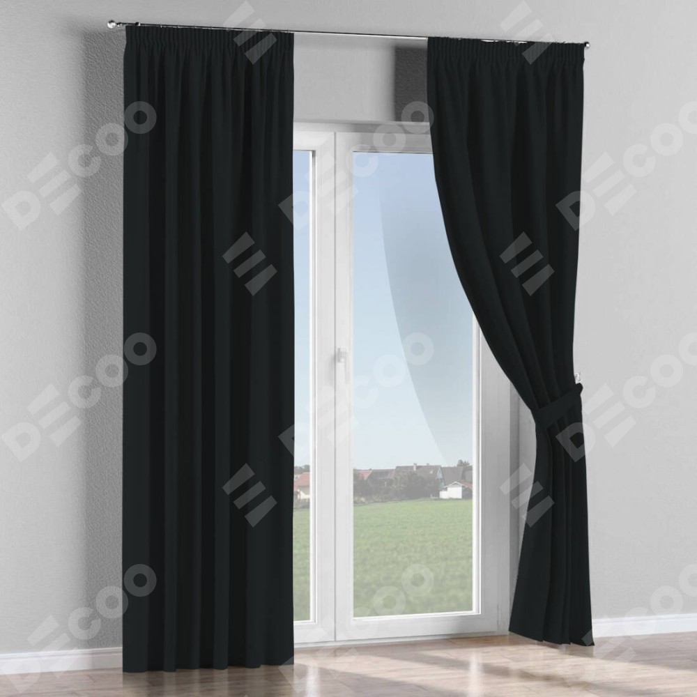 Комплект прямых штор, от производителя «Cortin», пошиты из ткани блэкаут однотонный черный, артикул ткани 91571−2. С изнаночной стороны в верхней части штор пристрачивается шторная лента с декоративными складками «Карандаш». Для создания элегантных складок прямые шторы шьются по стандарту с коэффициентом 1:2 (на 100 см. ширины проёма 200 см. ширины ткани).