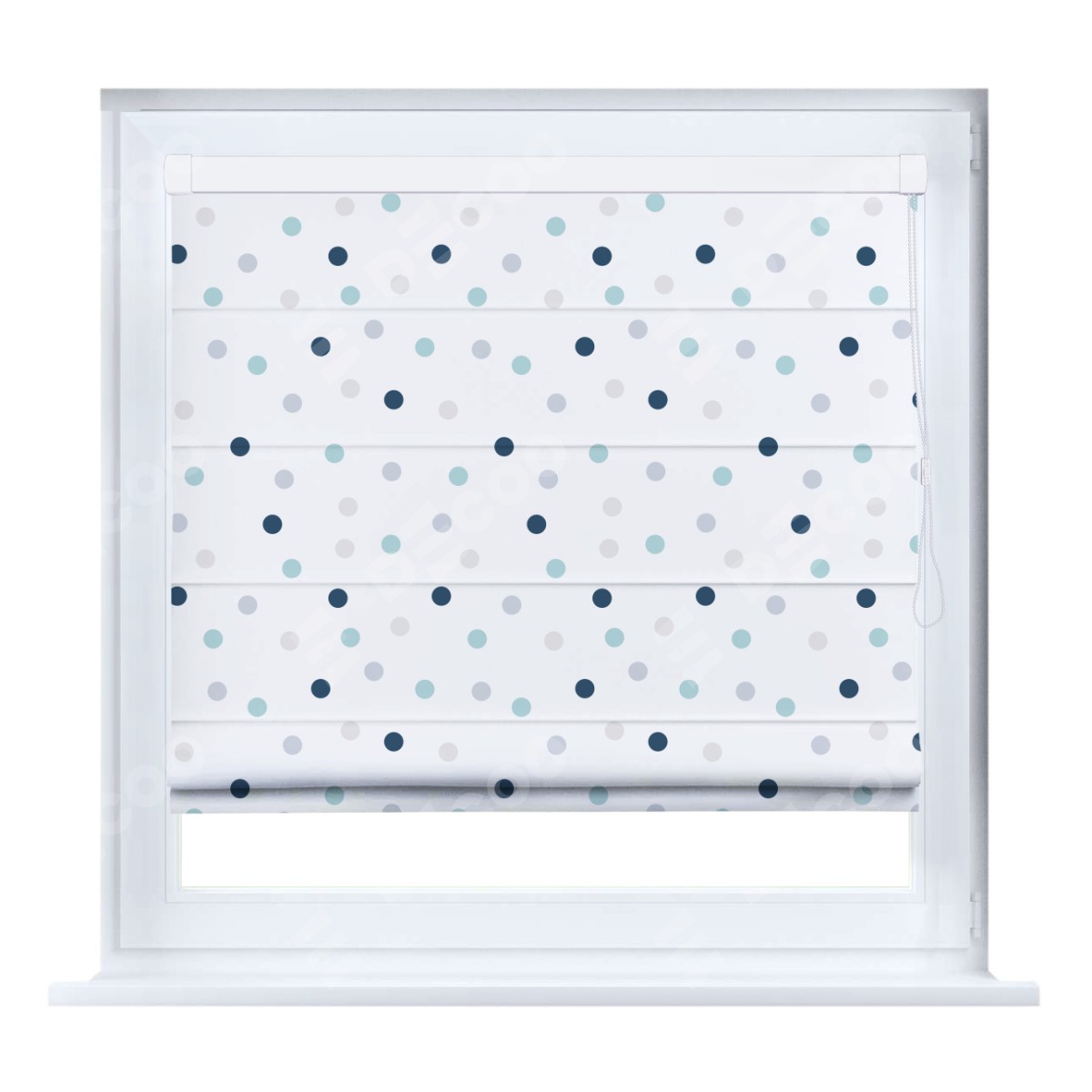 Римская штора кассетного типа, производителя «Cortin», устанавливается только на пластиковые окна и прилегает к стеклопакету, пошита из ткани блэкаут с нанесением сублимационной печати «Точки».