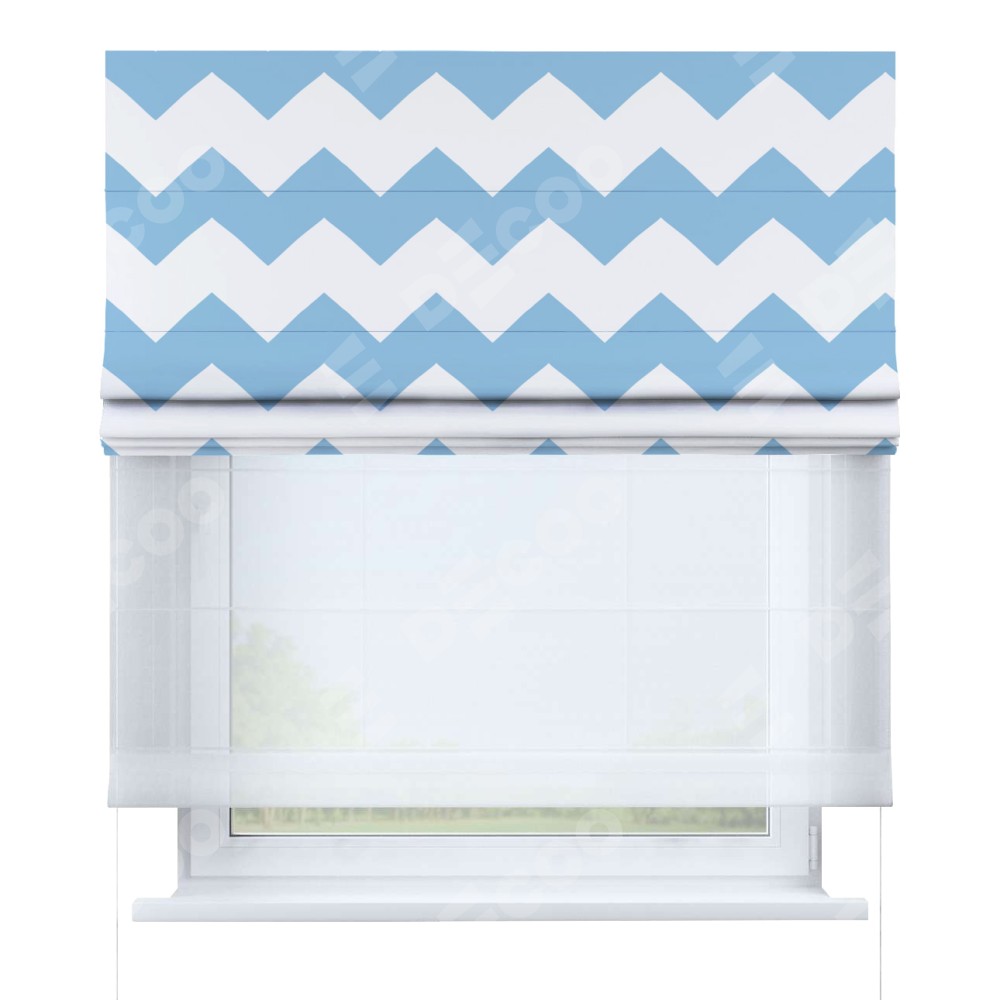 Римская штора день-ночь производителя «Cortin», используется для проёма, пошита из двух полотен, с лицевой блэкаут с нанесением сублимационной печати «Зигзаг крупный», вторая ткань тюль (по стандарту комплектуется тюль белого цвета артикул V-01). Имеет универсальный механизм и подходит для монтажа: на потолок, на стену и в нишу.