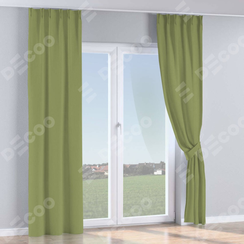 Комплект прямых штор, от производителя «Cortin», пошиты из ткани бархат золотая оливка, артикул ткани 90725. С изнаночной стороны в верхней части штор пристрачивается шторная лента с декоративными складками «Кустик». Для создания элегантных складок прямые шторы шьются по стандарту с коэффициентом 1:2 (на 100 см. ширины проёма 200 см. ширины ткани).