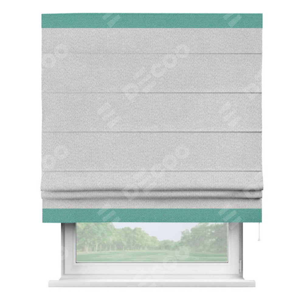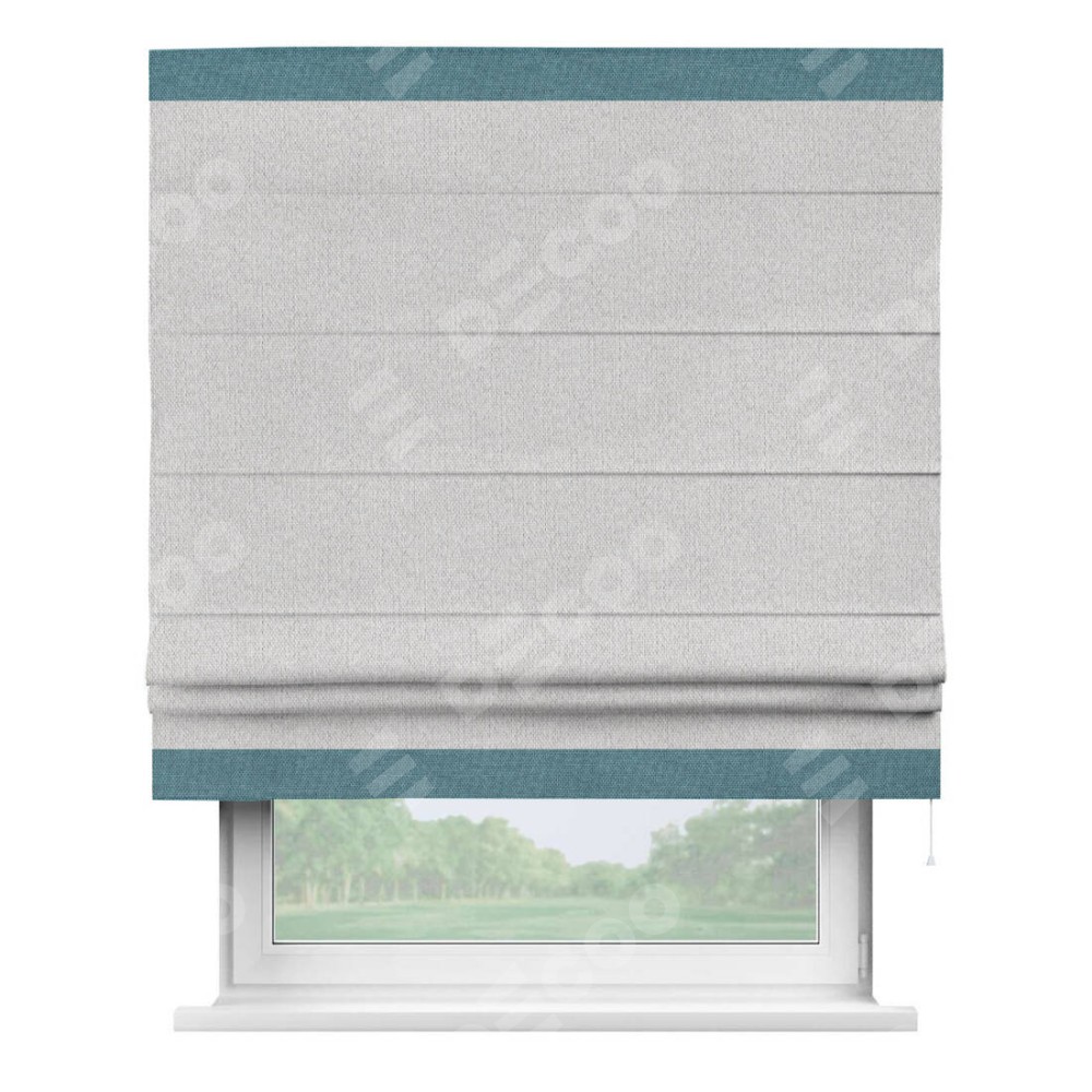 Римская штора производителя «Cortin», используется для проёма, пошита из ткани лён димаут светло-бежевый, артикул 90993. Отделка шторы кантом «Горизонт», ткань для канта используется из льна димаут разной расцветки на выбор. Имеет универсальный механизм и подходит для монтажа: на потолок, на стену и в нишу.