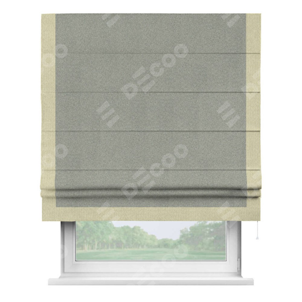 Римская штора производителя «Cortin», используется для проёма, пошита из ткани лён димаут серый, артикул 91009. Отделка шторы кантом «Виктория», ткань для канта используется из льна димаут разной расцветки на выбор. Имеет универсальный механизм и подходит для монтажа: на потолок, на стену и в нишу.
