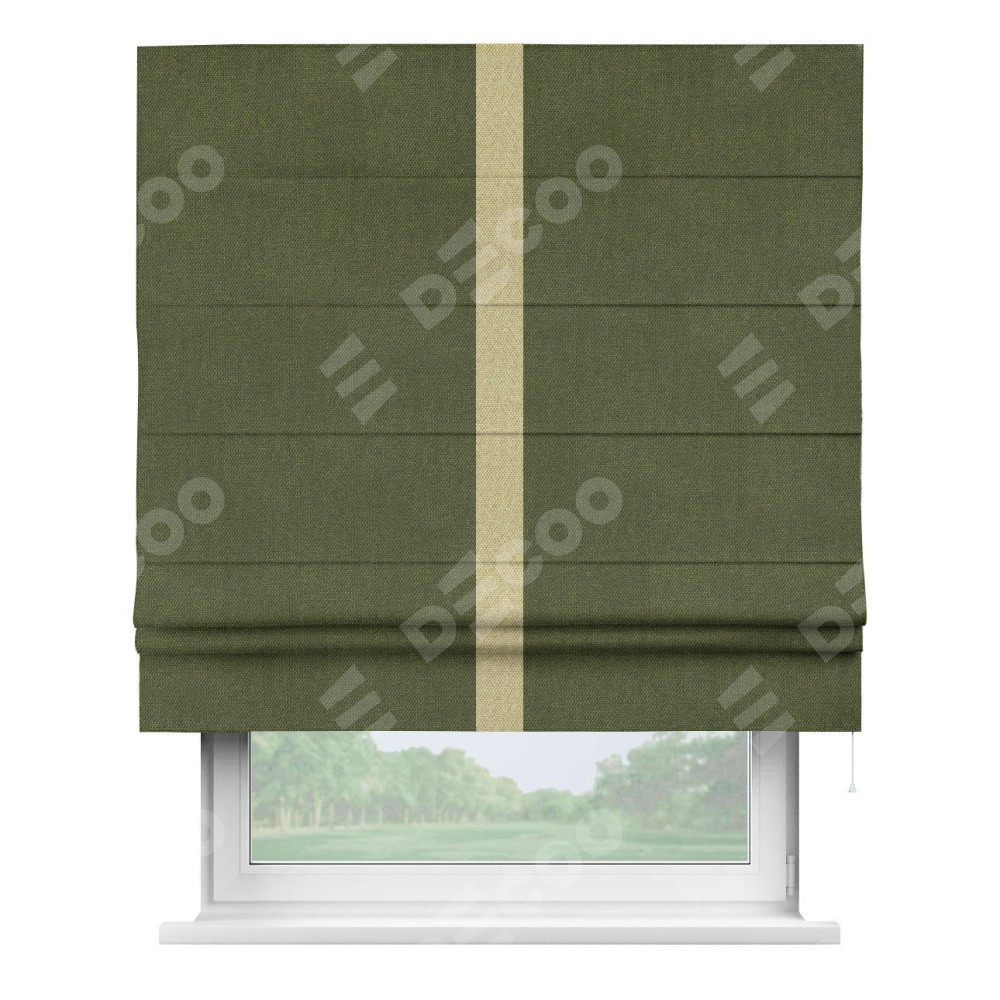 Римская штора производителя «Cortin», используется для проёма, пошита из ткани лён димаут салатовый, артикул 91002. Отделка шторы кантом «Хайвэй», ткань для канта используется из льна димаут разной расцветки на выбор. Имеет универсальный механизм и подходит для монтажа: на потолок, на стену и в нишу.