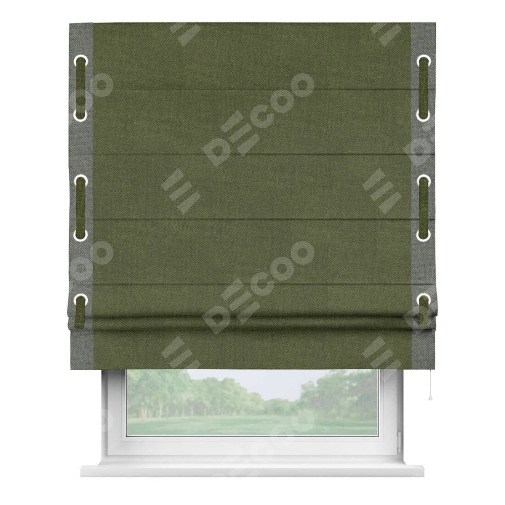 Римская штора «Кортин» для проема, лён димаут салатовый с кантом Стрим Дуо (люверсы с пояском)