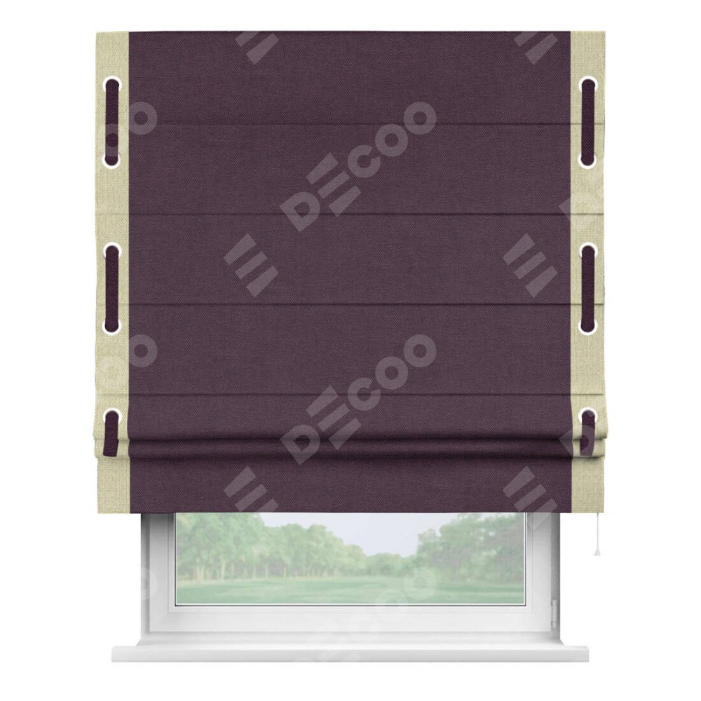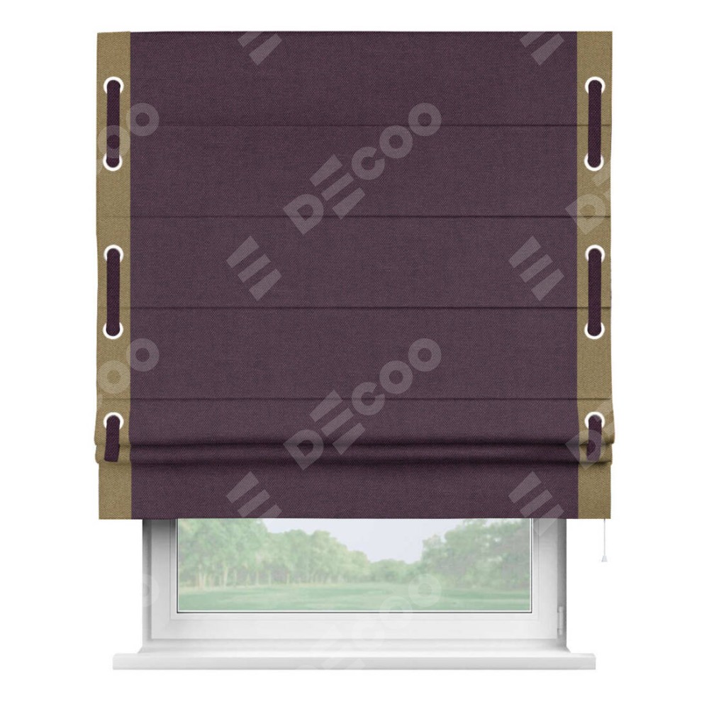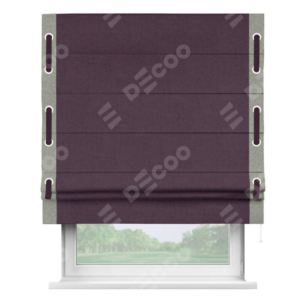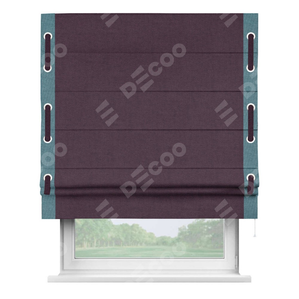 Римская штора производителя «Cortin», используется для проёма, пошита из ткани лён димаут фиолетовый, артикул 16267. Отделка шторы кантом «Стрим Дуо» на кантах расположены люверсы с пояском, ткань для канта используется лён димаут разной расцветки на выбор. Ткань для пояска обычно используется из основной ткани шторы, а так же можно сделать из любой расцветки по желанию. Имеет универсальный механизм и подходит для монтажа: на потолок, на стену и в нишу.